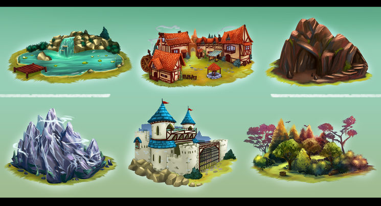 Los 6 tipos de paisajes son bosque, lago, montaña, castillo, villa y cuevas. En las cartas de manía del príncipe o la princesa aparecerán estos paisajes indicando en qué condiciones podría atravesarlos.