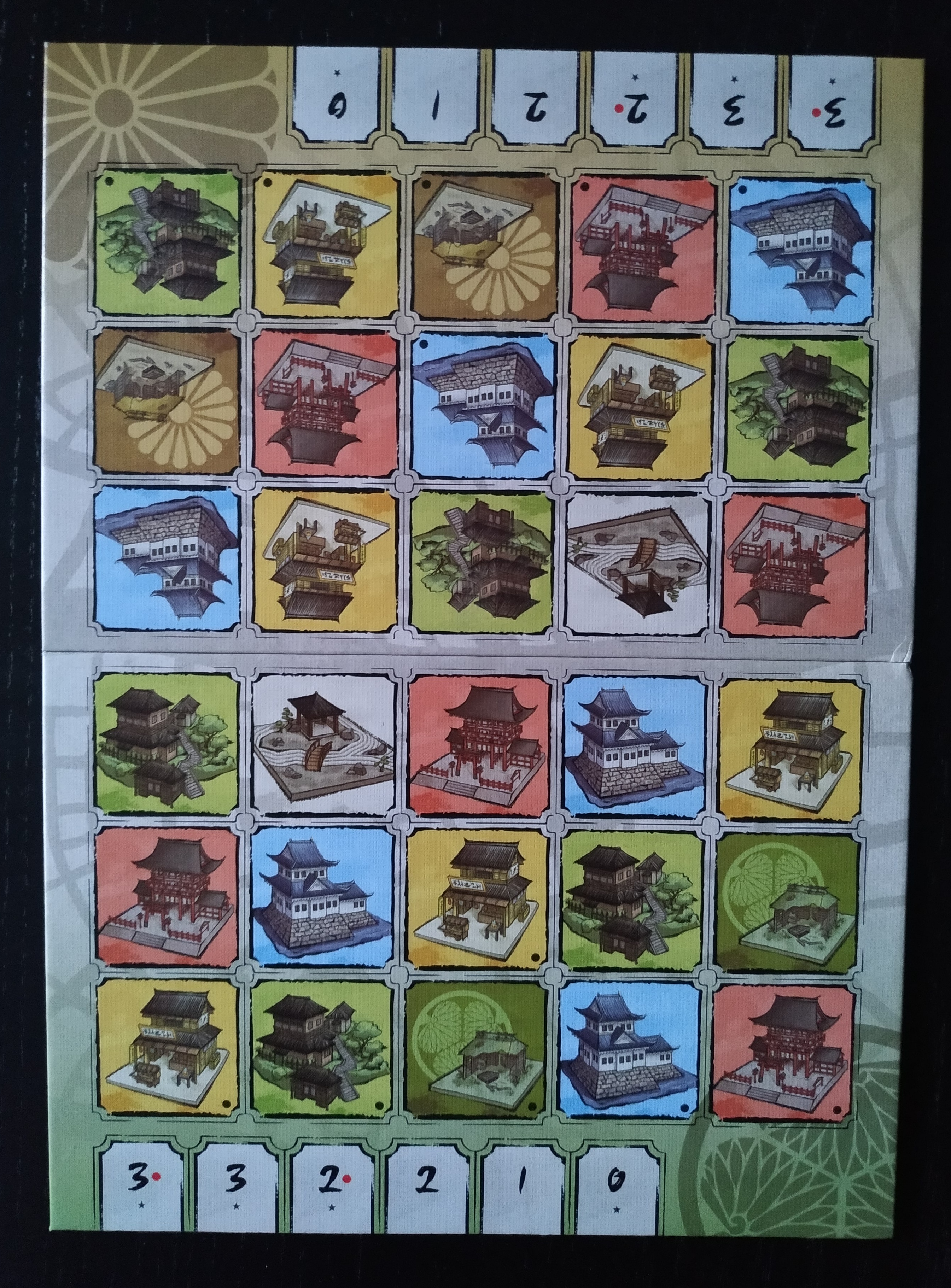 Se coloca el tablero en el centro de la mesa. Los jugadores deben colocarse uno en frente del otro. El lado del tablero de color verde, que representa el territorio Oniwaban debe estar delante del jugador que tenga dicha facción. El lado del color dorado es para el jugador que lleve a los Meji.