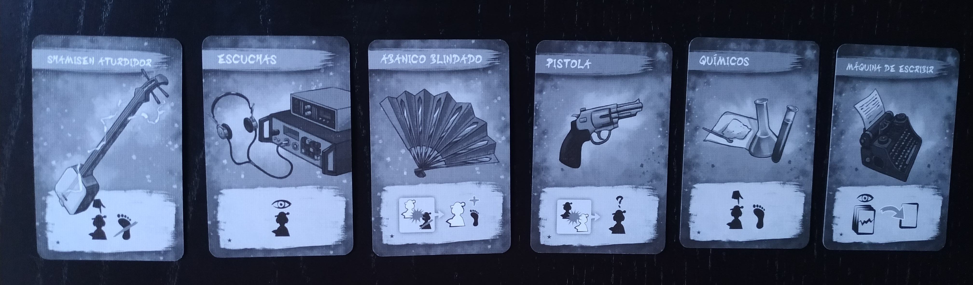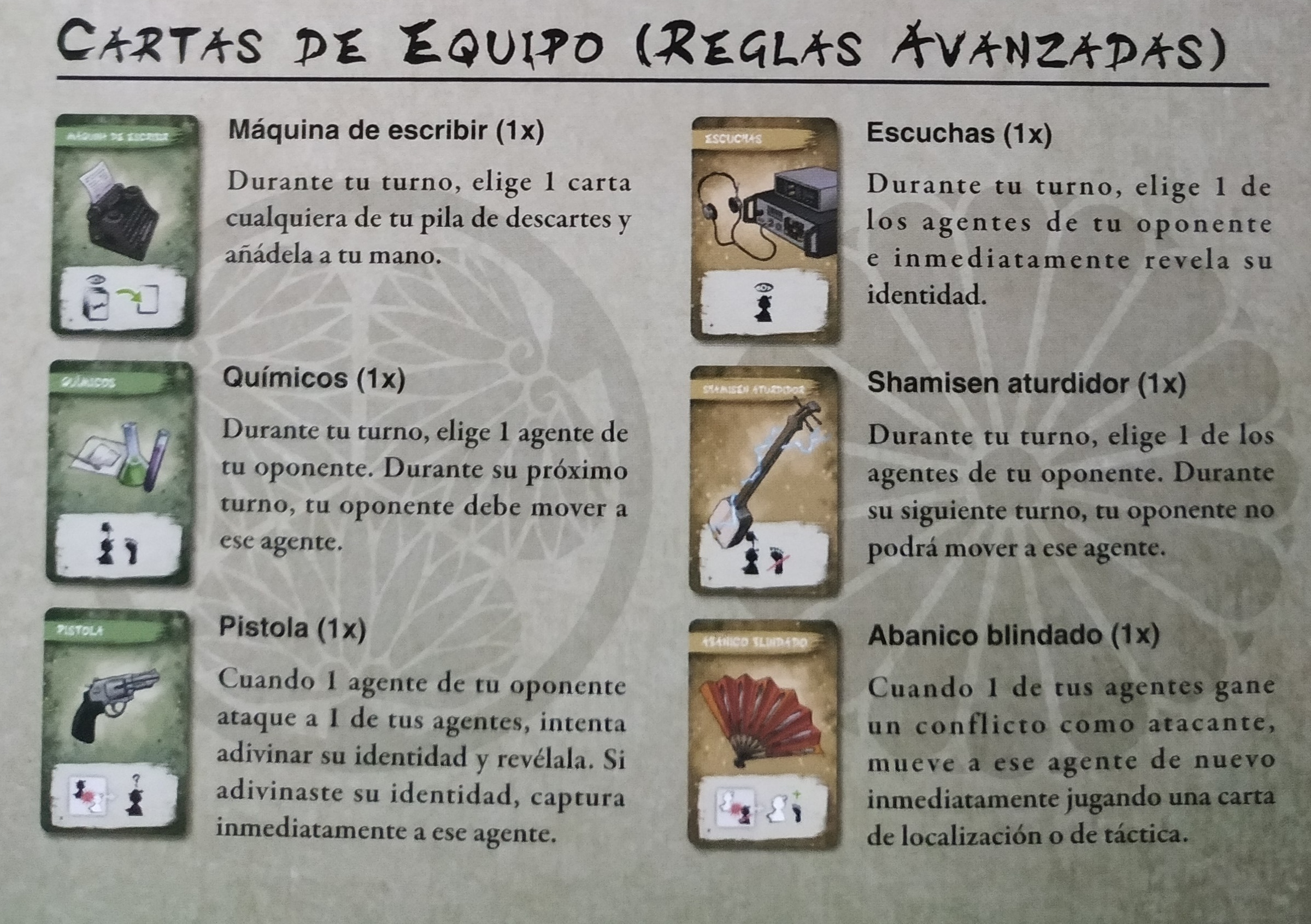 Una vez que uno de los agentes de un jugador haya sido capturado (ya sea real o falso), el jugador puede girar una de las cartas de Equipamiento. Ahora el jugador puede usar su habilidad.