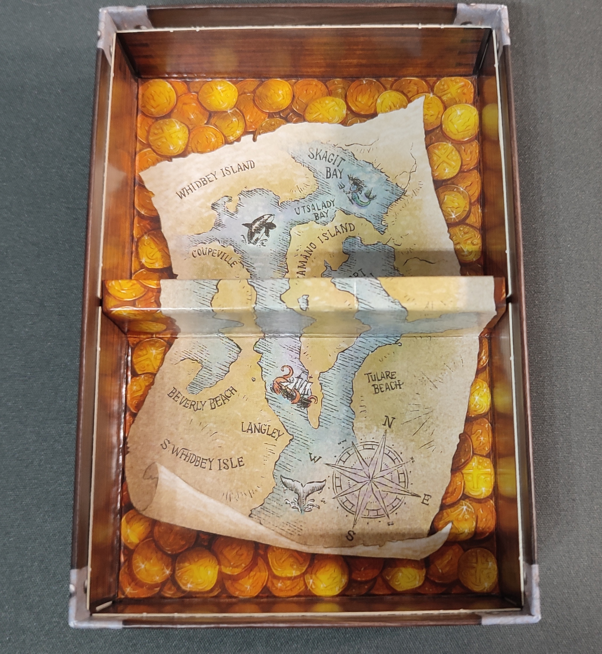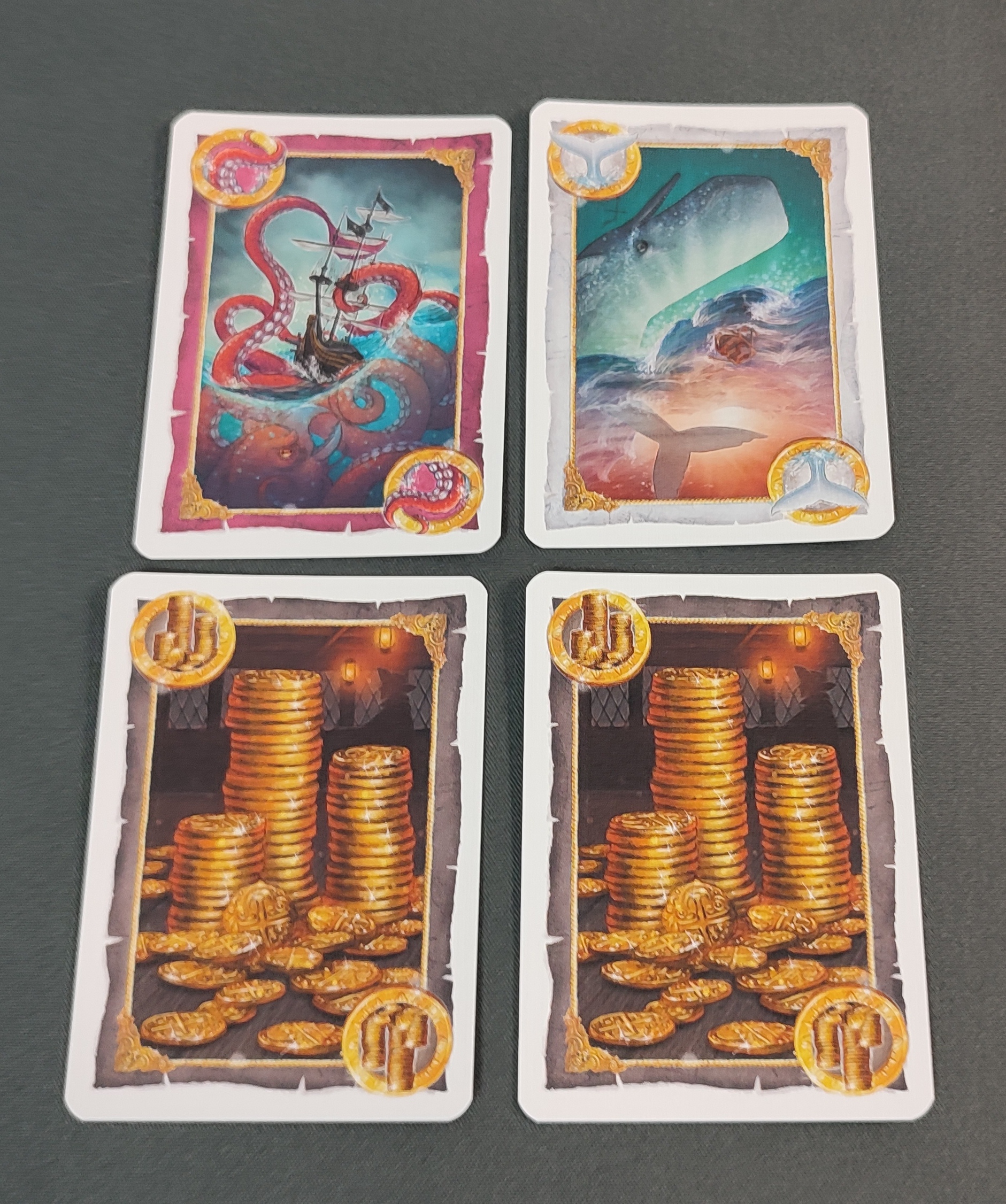 En cuanto a la temática, es cierto que podría haber sido cualquier otra y el juego hubiera funcionado exactamente igual, o incluso sin tema se podría jugar perfectamente, pero el que se haya elegido la temática pirata nos parece todo un acierto y le sienta muy bien. No es que nos vayamos a sentir como un pirata buscando tesoros y combatiendo ante otros piratas, pero sí que le da un sabor muy agradable a las partidas.
