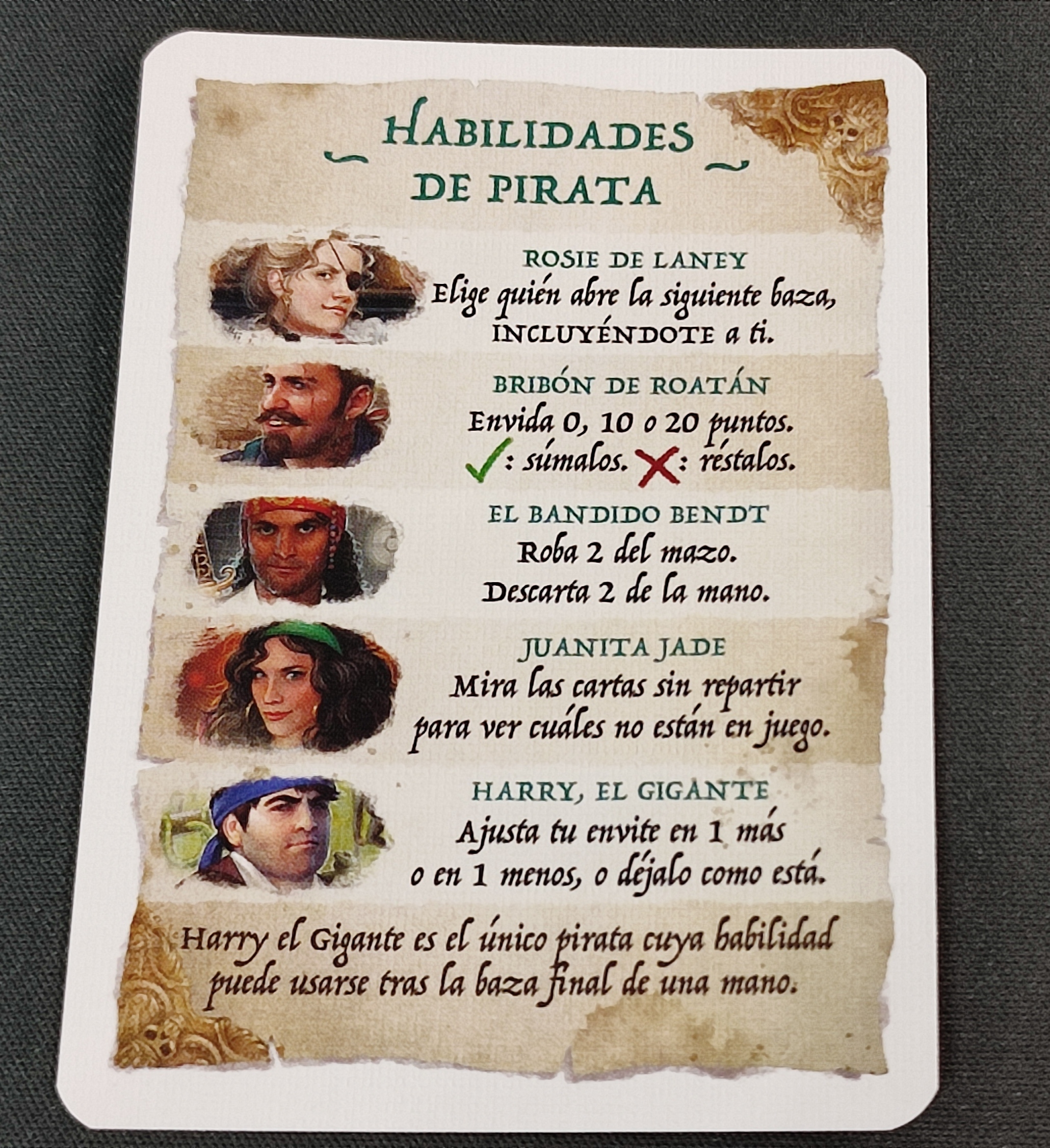 Cada uno de los piratas tiene una habilidad especial asociada. Para desbloquear dicha habilidad, el jugador primero debe ganar una baza con ese pirata y debe usarla de forma inmediata salvo que se indique lo contrario.