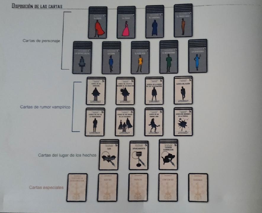 Obviamente, si han cambiado tanto los colores y la ilustración de la portada para ir acorde con la nueva temática, que por cierto, hará las delicias de los amantes de los vampiros, pero el resto de los componentes son muy parecidos, teniendo múltiples cartas de diferentes categorías y teniendo los marcadores de investigación necesarios para conseguirlas.
