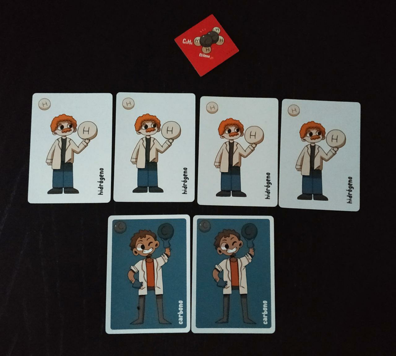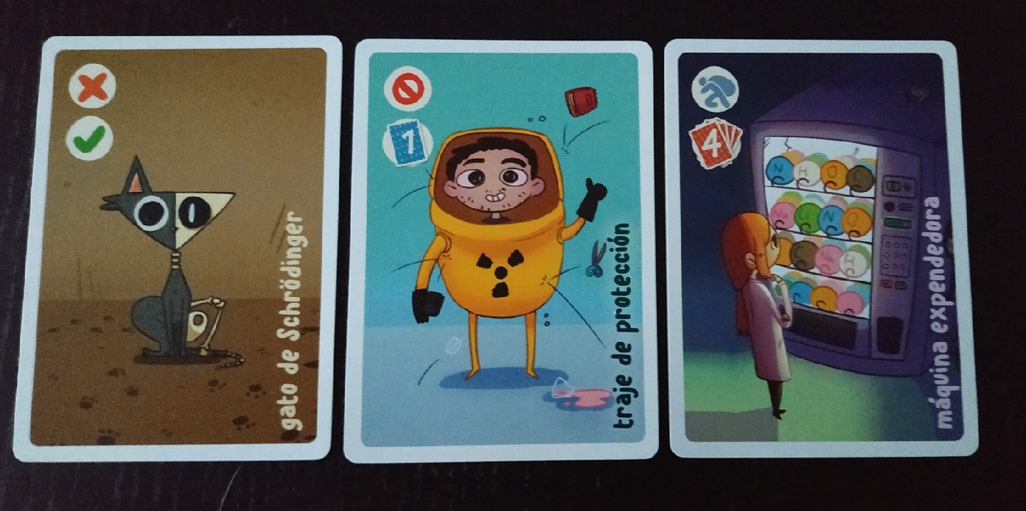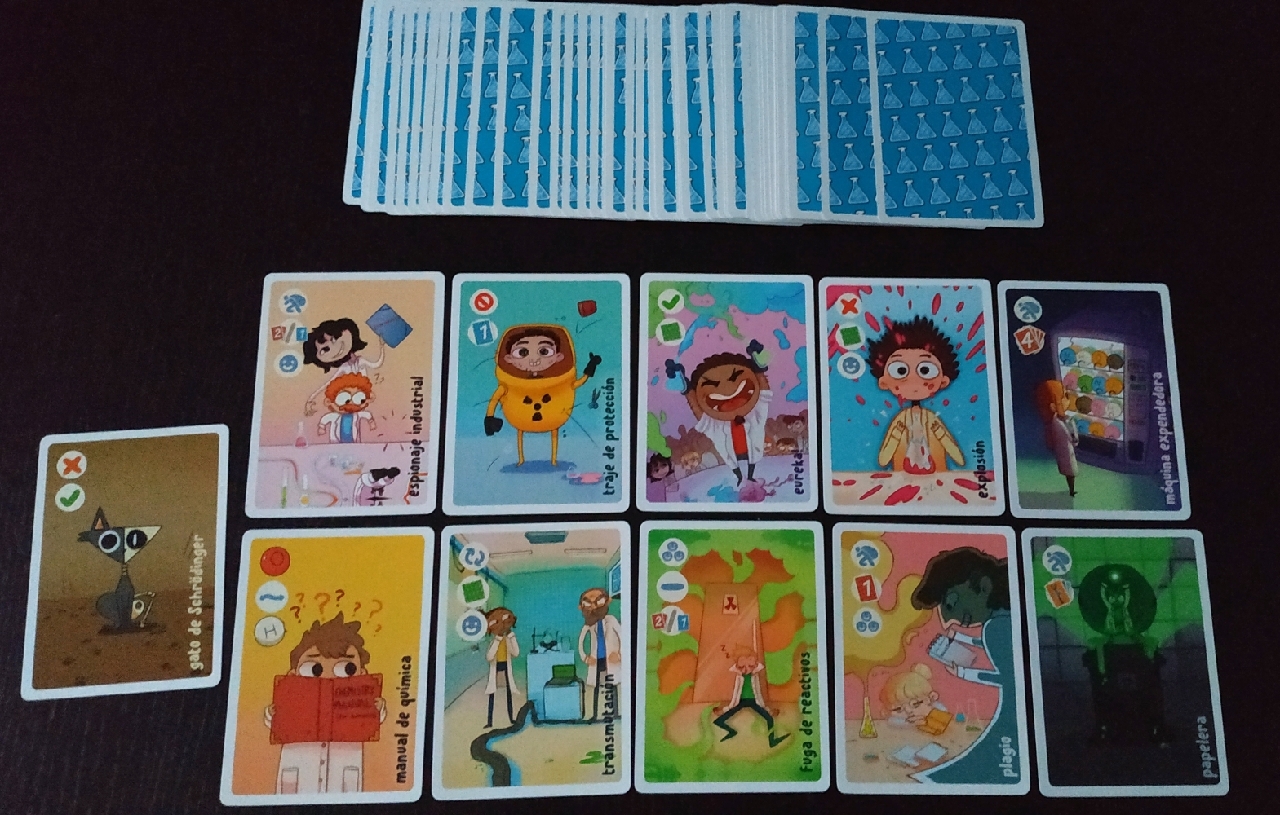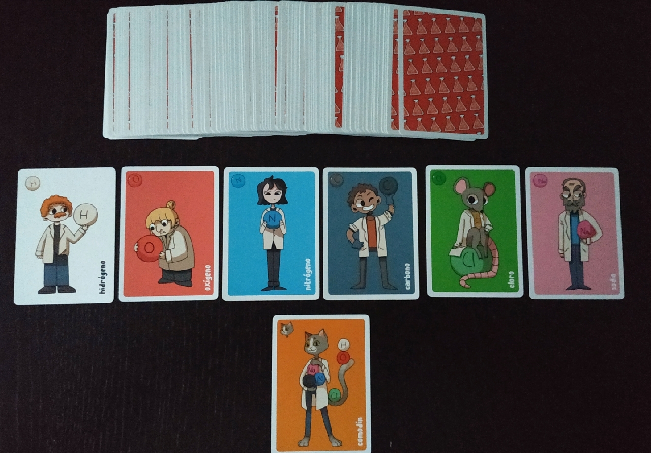 Además, el juego viene cargado de losetas de compuestos químicos y de cartas. Las cartas son nada más y nada menos que 168. Seis de estas cartas son cartas de ayuda que vienen fenomenal para las primeras partidas, 108 son las cartas de los seis diferentes elementos que contempla el juego, más uno extra que ejerce de comodín y las 54 cartas especiales que son las que utilizamos los jugadores para aplicar acciones o efectos en la partida. Todas ellas son de buena calidad y con unas ilustraciones muy simpáticas.