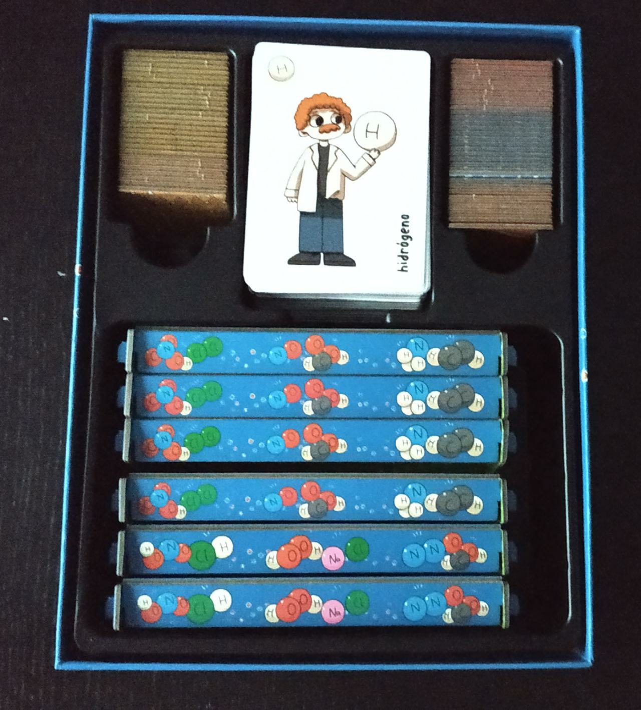 Para empezar, queremos hablar sobre su estética y componentes. El juego viene en una caja de tamaño medio con una ilustración que nos mete de lleno en su temática ya que no deja lugar a dudas de que estamos ante un juego relacionado con la química. Una de las cosas que más nos ha gustado es la cuna que se encuentra en su interior para colocar perfectamente todos los componentes del juego, incluidos los seis tableros de los jugadores que debemos montar para darle la forma de una mesa de trabajo.