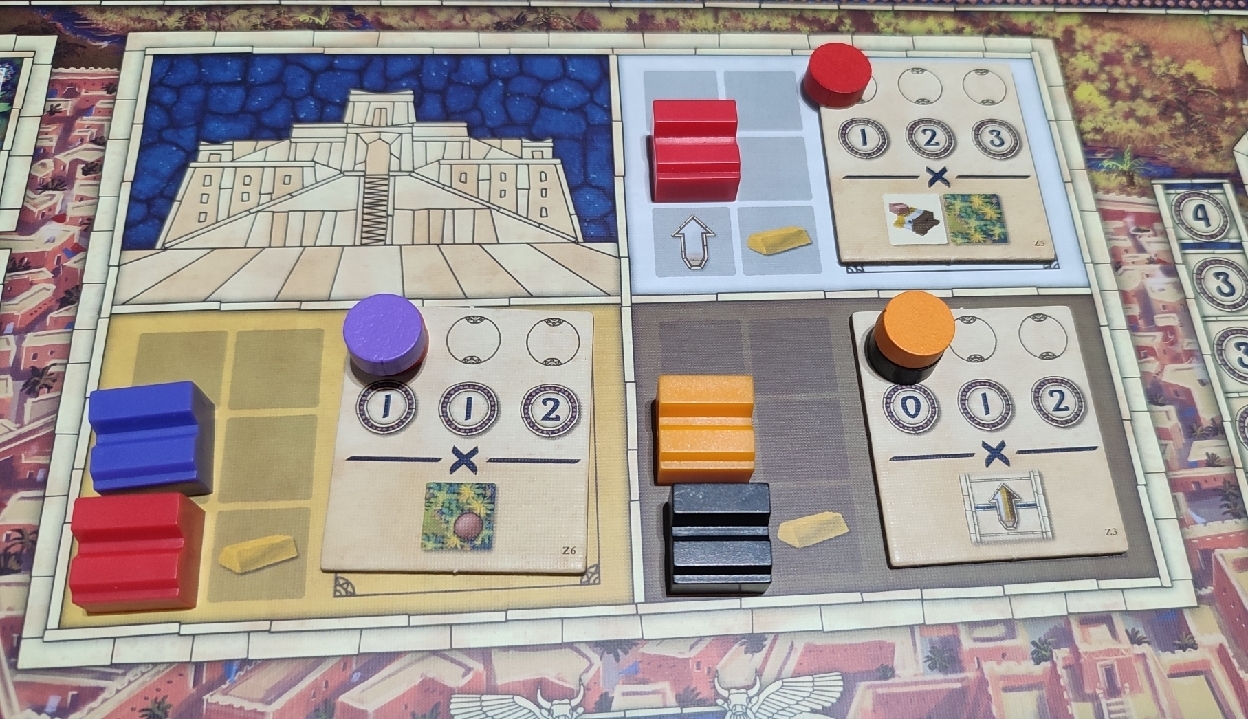 El otro distrito es el ziggurat y en él, los jugadores tendrán que ir construyendo sus casas para también adquirir diferentes bonus y además para conseguir puntos de victoria en función del número de casas que vayan construyendo en cada uno de los ziggurat disponibles.