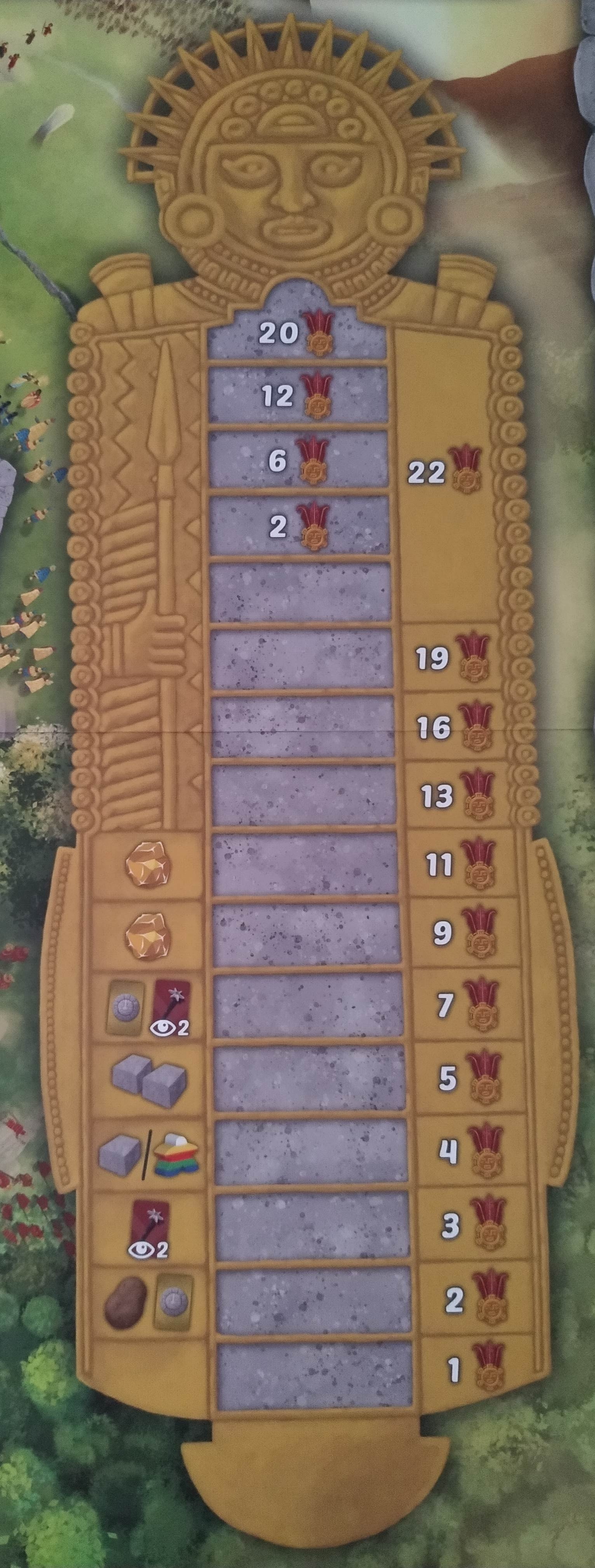 En la zona derecha encontramos el templo, con una columna central (con puntos en los últimos niveles) flanqueada por una columna izquierda con posibles beneficios inmediatos y una columna derecha con puntos de victoria que se obtienen en los festivales.