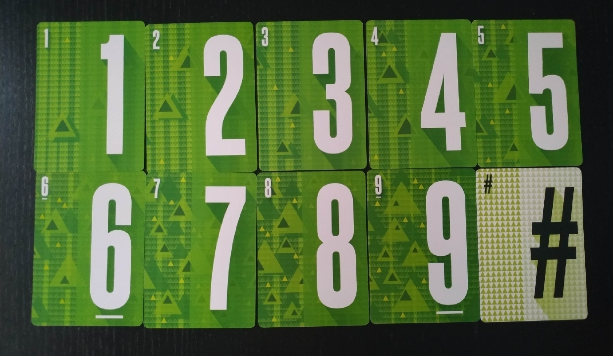 - Cartas de número: Son cartas que muestran un número de color blanco del 1 al 9 y que tienen de fondo 4 colores: azul, verde, naranja o rosa. Tendremos más cartas con números bajos que de los altos (el 7, 8 y 9).