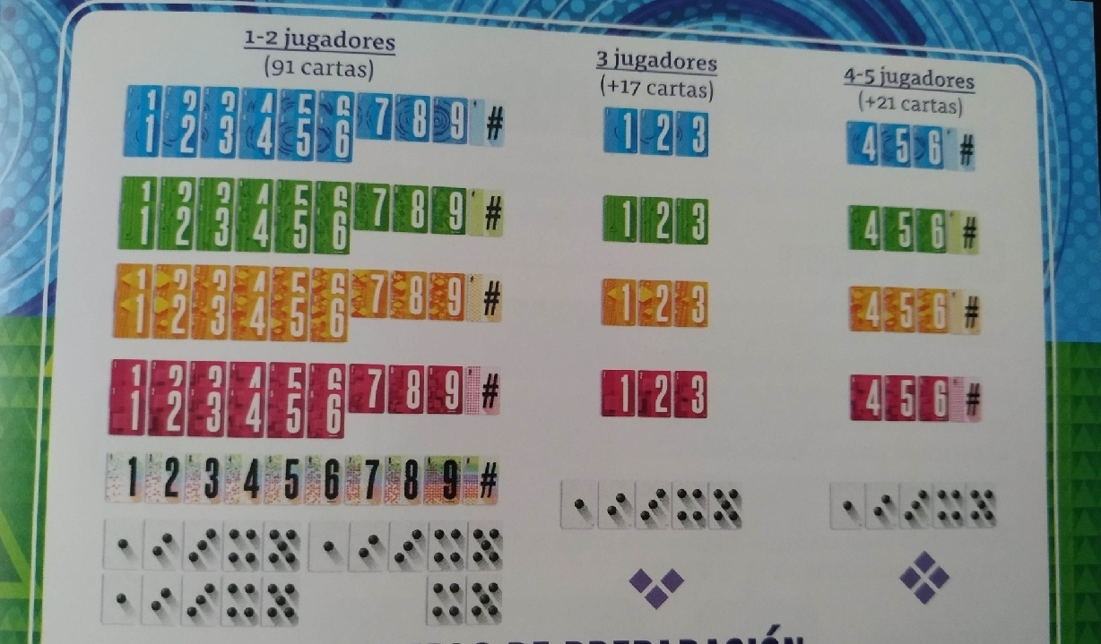 Si somos 2 jugadores, eliminaremos las que tengan 3 y 4 puntitos, si somos 3 jugadores, eliminaremos las que tengan 4 puntitos y si somos 4 o 5 jugadores, no tendremos que dejar ninguna carta aparte.