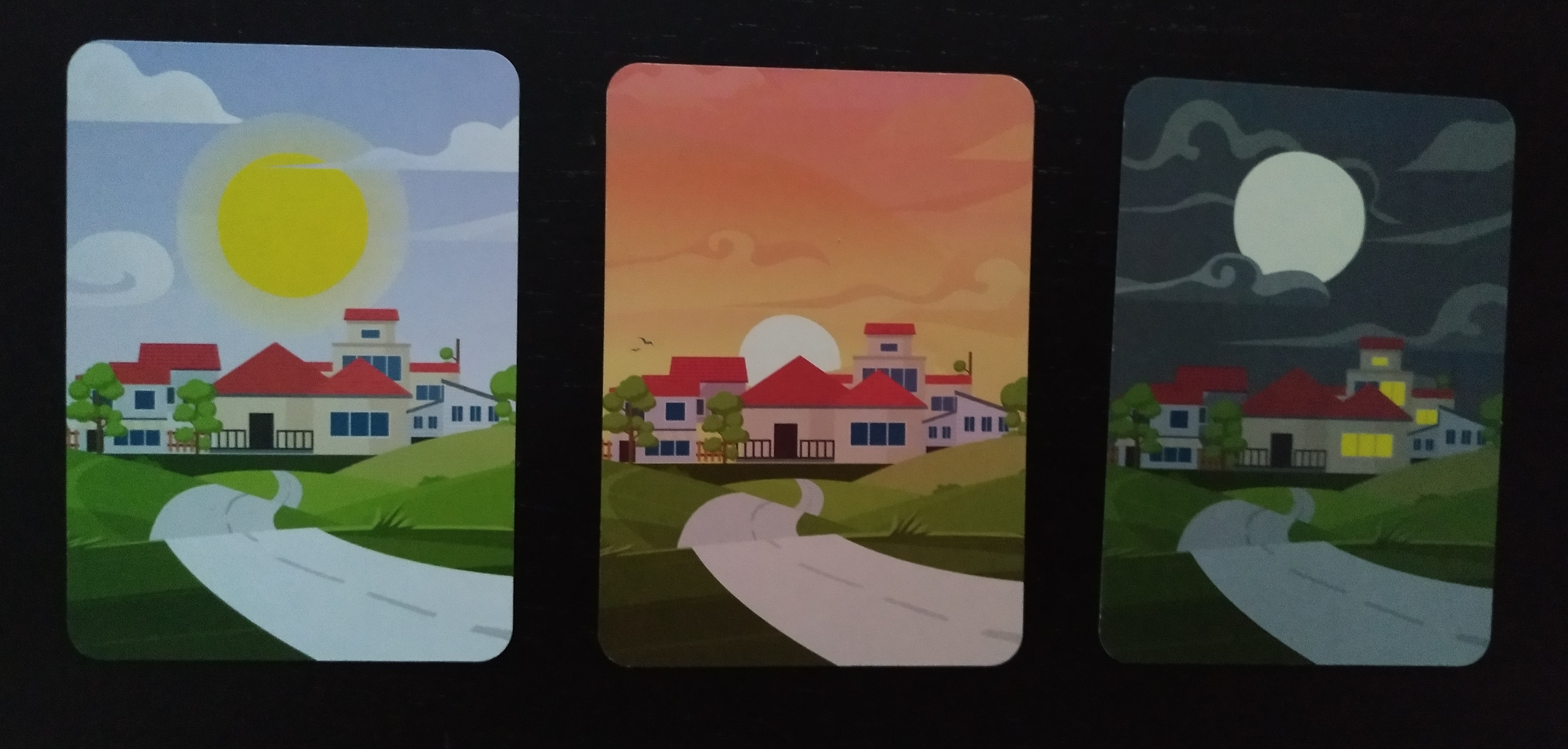 Cada jugador coge una ficha de madera de un color y colocamos las 3 cartas de franja horaria sobre la mesa.