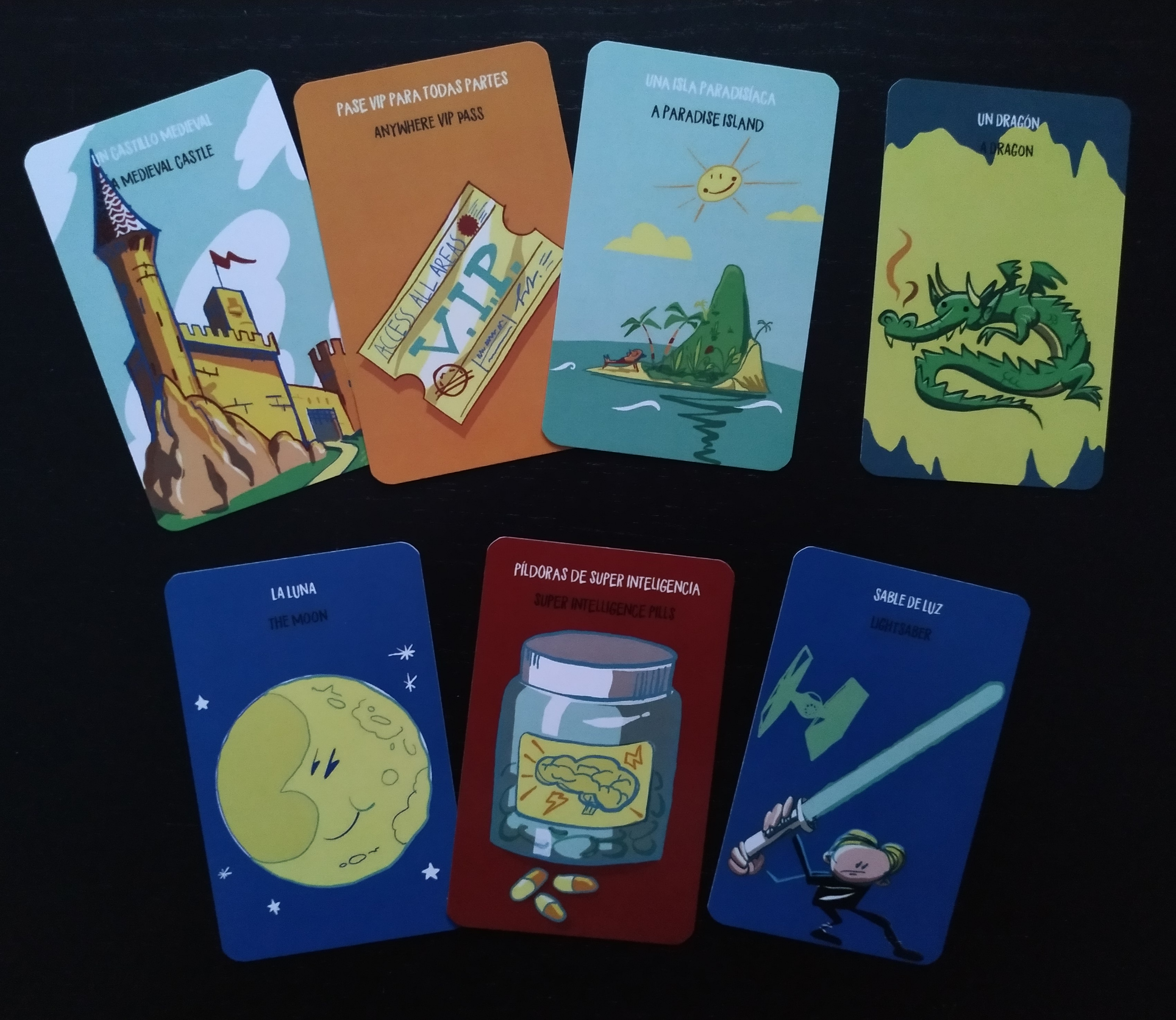 Los trazos de las ilustraciones que componen el juego son sencillos a la par que muy ilustrativos, siendo acertado ya que es un juego al que jugarán principalmente niños. Además nos ha gustado que en la parte superior de las cartas venga escrito de qué se trata (en español e inglés) por si alguno de los más peques no está familiarizado con ese concepto. Otro punto a favor de que venga en ambos idiomas es que fomentamos la mejora del inglés pudiendo incluso incluyendo en las partidas que se deba leer el deseo en dicho idioma para ampliar vocabulario y mejorar pronunciación.