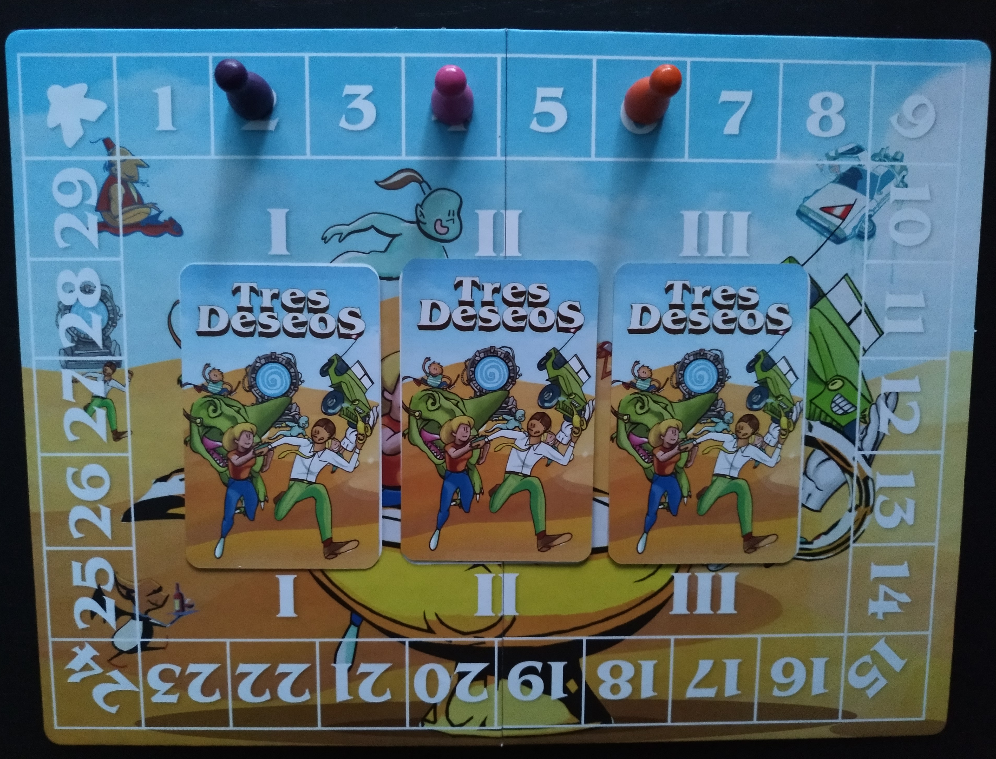 El jugador que tenga la carta de lámpara robará 3 cartas de deseos y las pone sobre el tablero. Veremos que cada deseo está identificado con los números I, II y III.