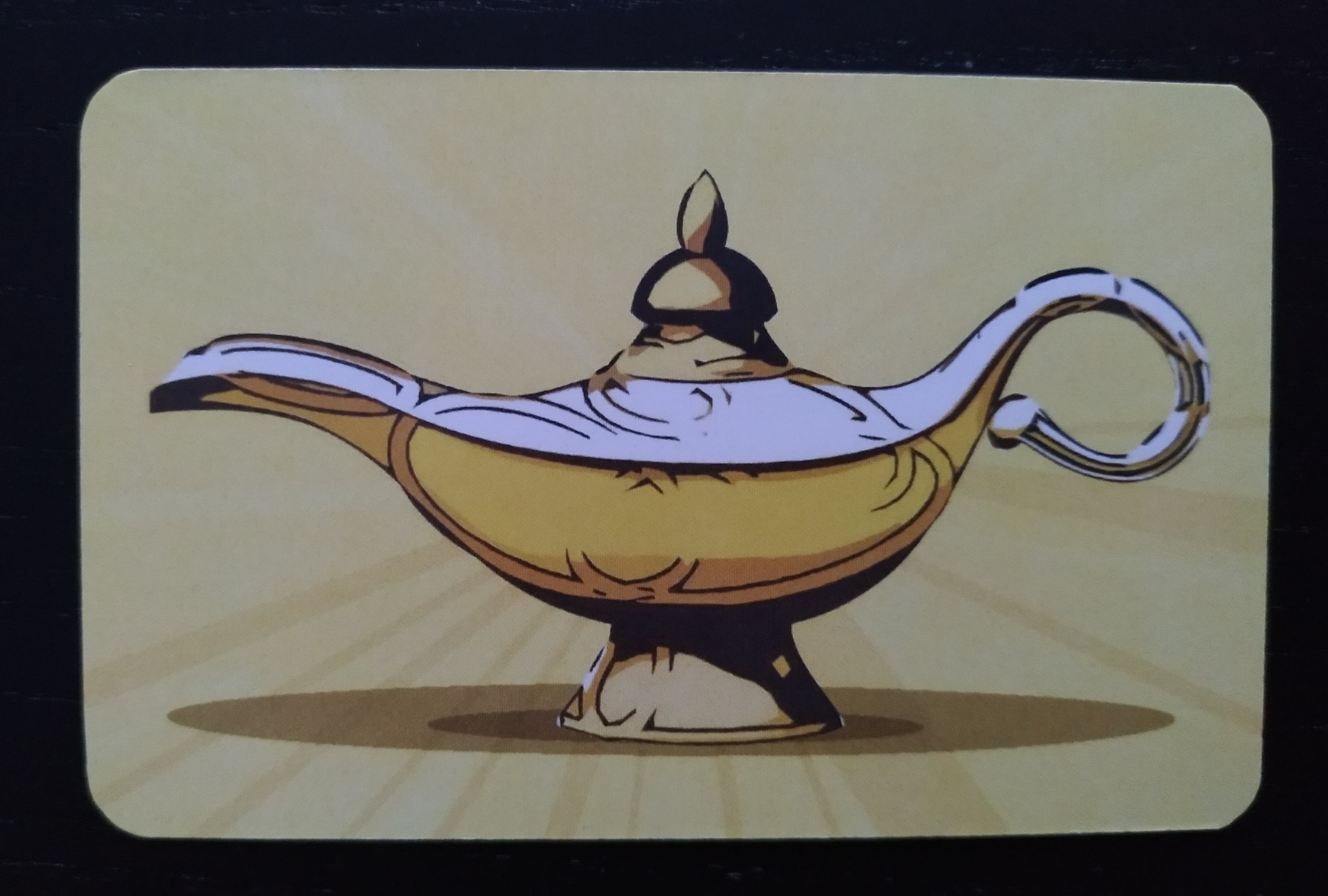 Todos los componentes son de calidad: cartas con grosor óptimo, meeples de madera, diamantes de tamaño adecuado y un tablero de grosor consistente. Es todo un punto a favor que la carta de jugador activo sea una lámpara de genio porque, si lo analizas, físicamente eres tú en el que ese momento está frotando la lámpara y aparece el genio para concederte tres deseos.