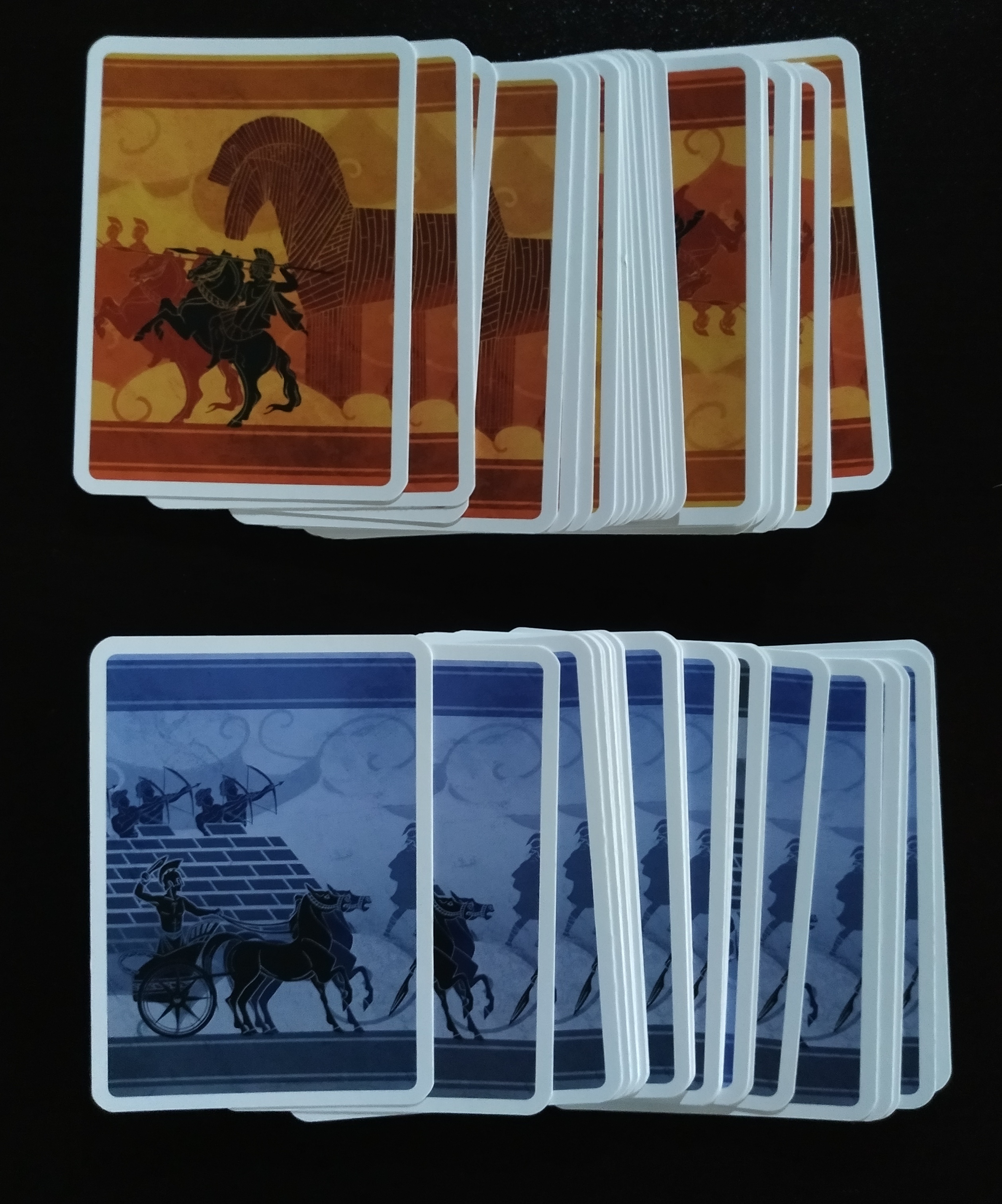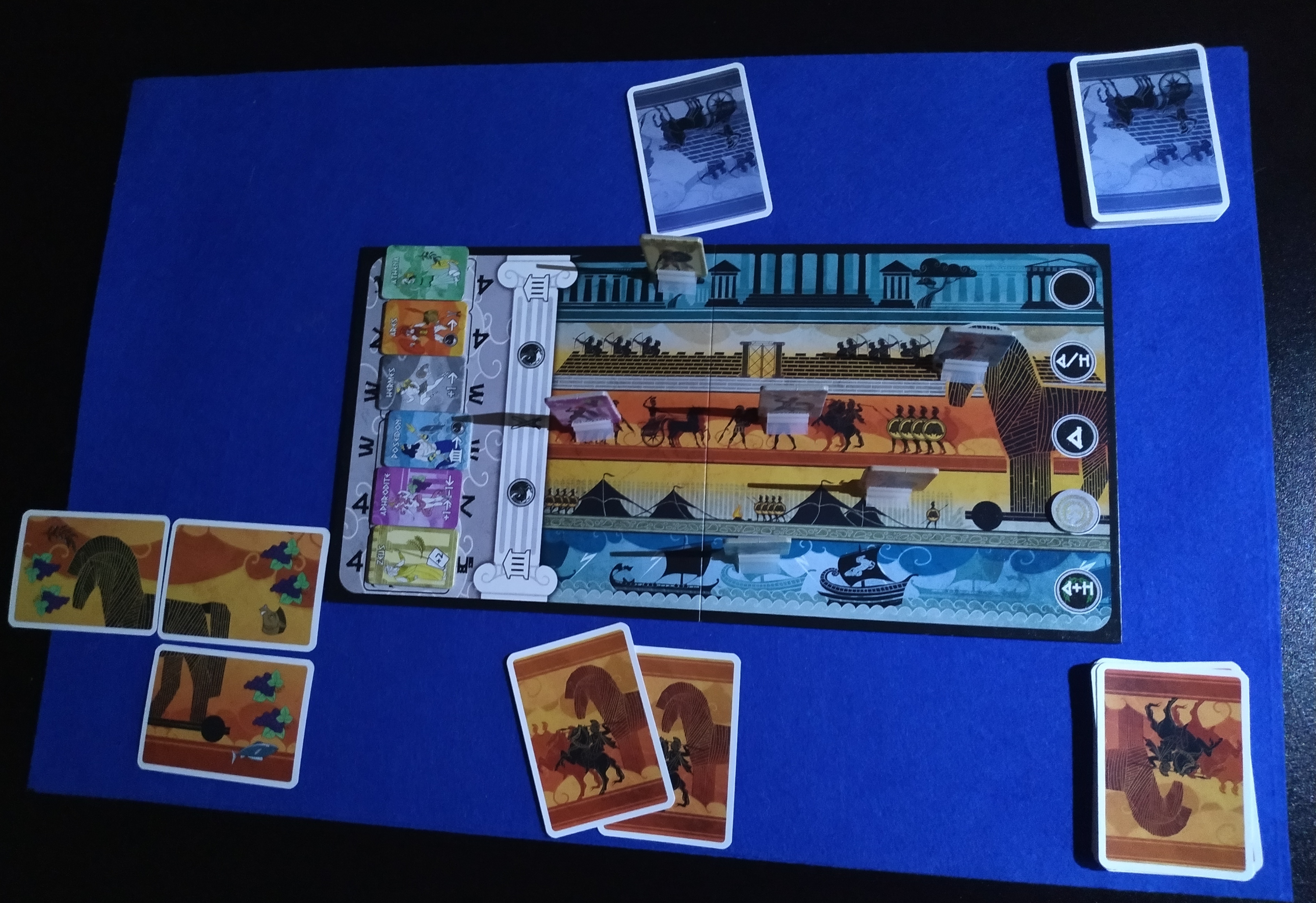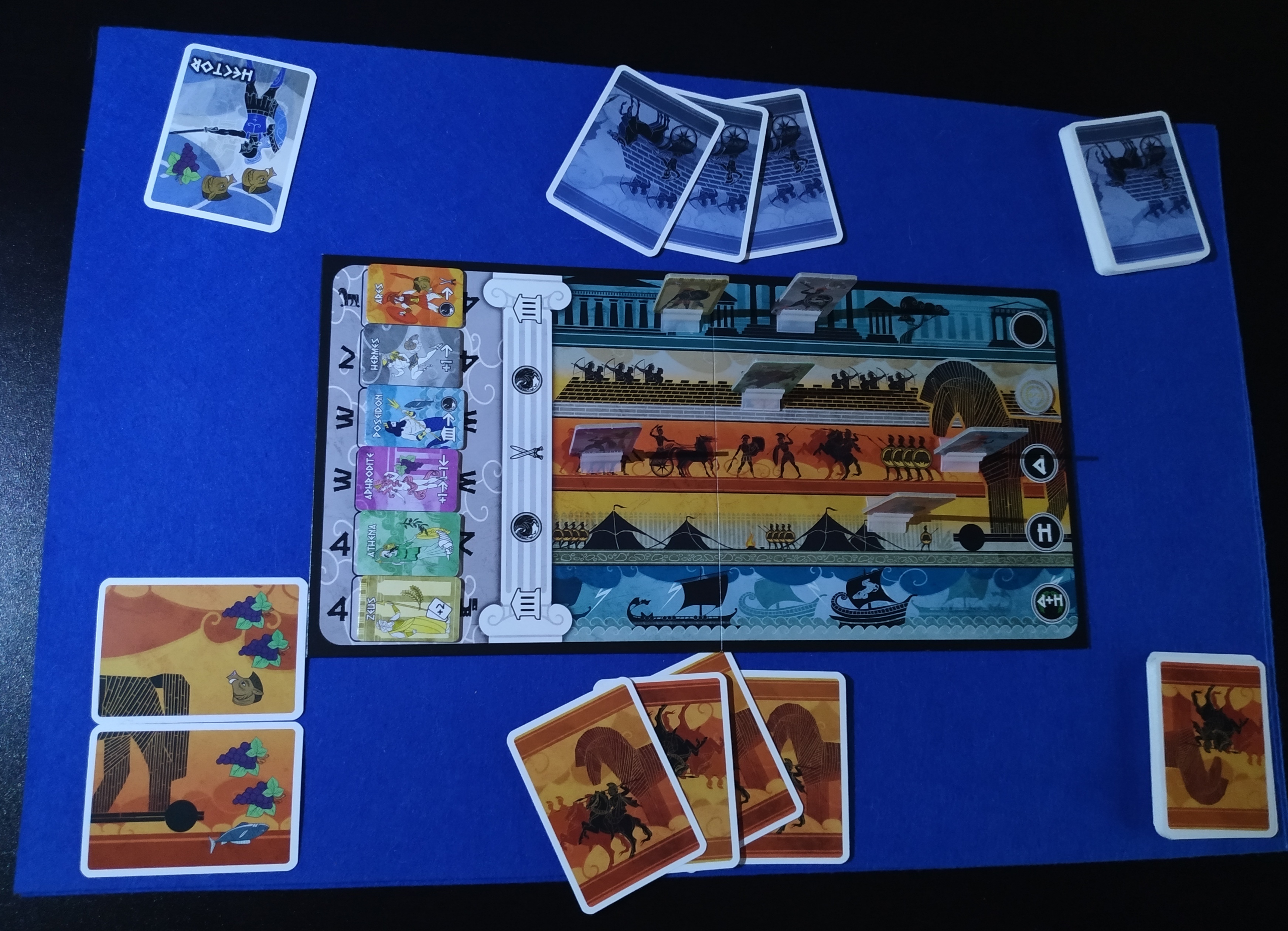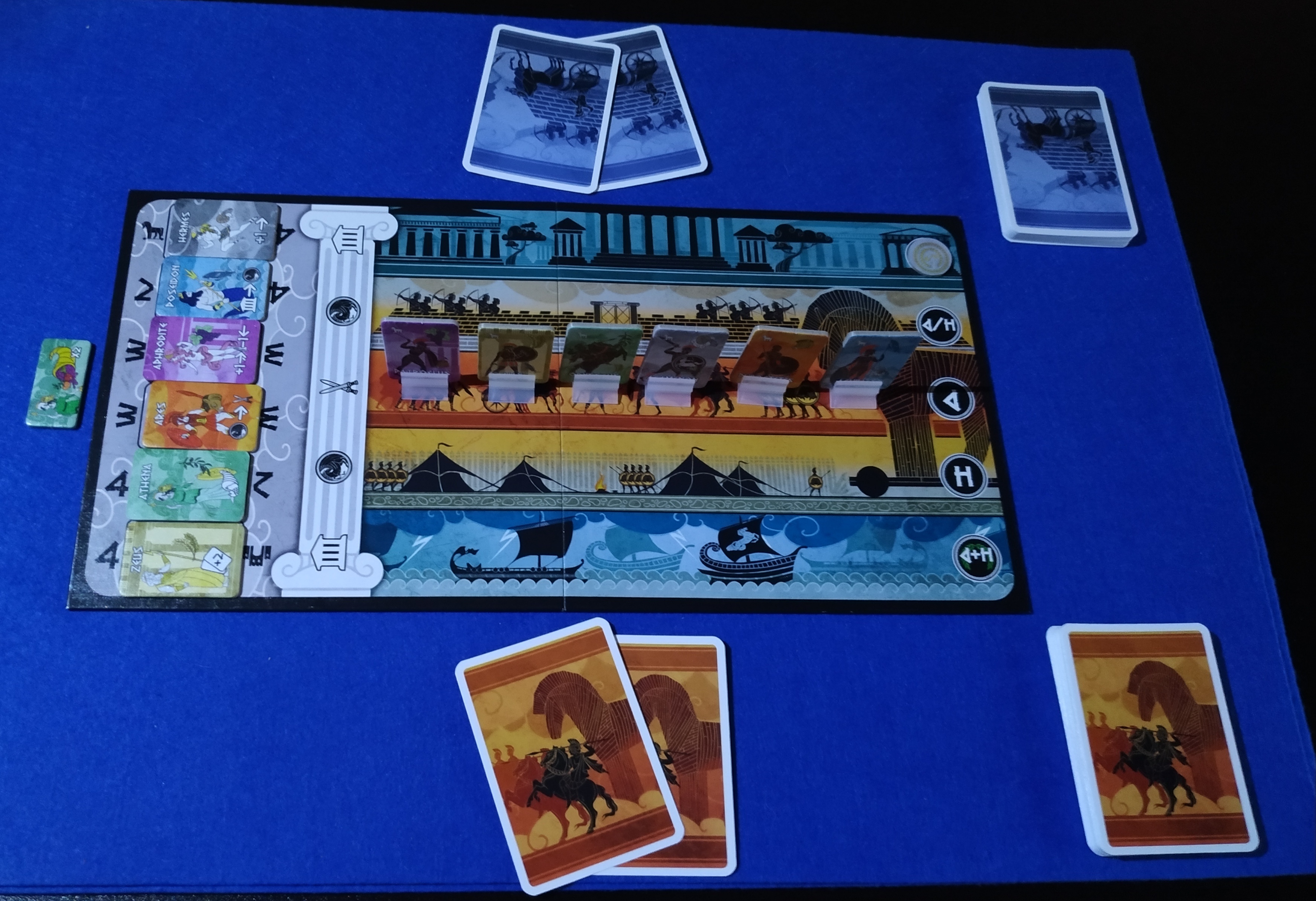 El jugador troyano coloca la ficha de Héctor y Paris en el camino inicial y por último cada jugador coge dos cartas del montón de la facción que le corresponde.