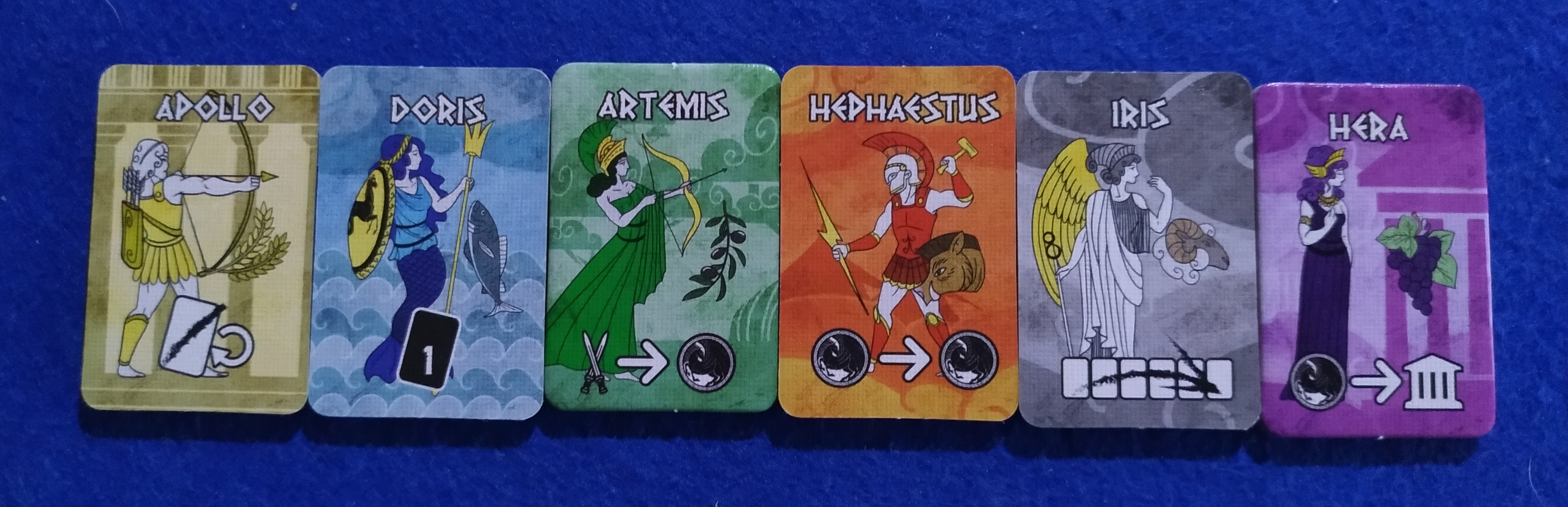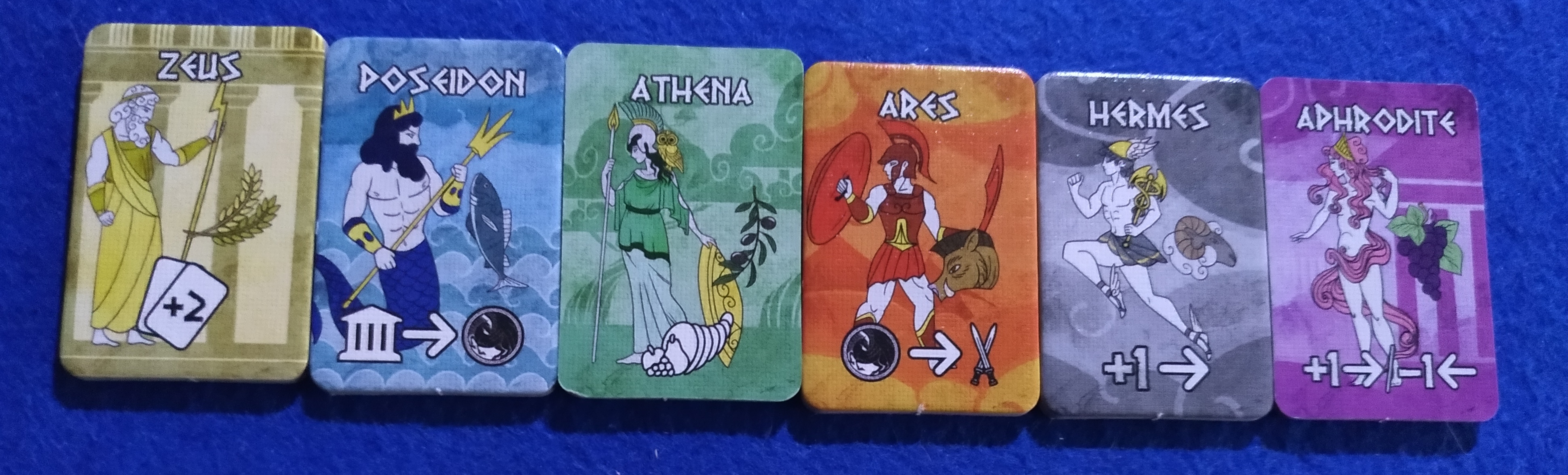 Cada uno de estos Dioses otorgan diferentes habilidades al jugador que les haya hecho la ofrenda que demandan. La peculiaridad es que el valor de activación (el valor de la ofrenda) está totalmente enfrentado según qué jugador que lo active. Es decir, el Dios que para un jugador cuesta 5 para el otro cuesta 1, el que cuesta 4 para el otro cuesta 2 y así sucesivamente.