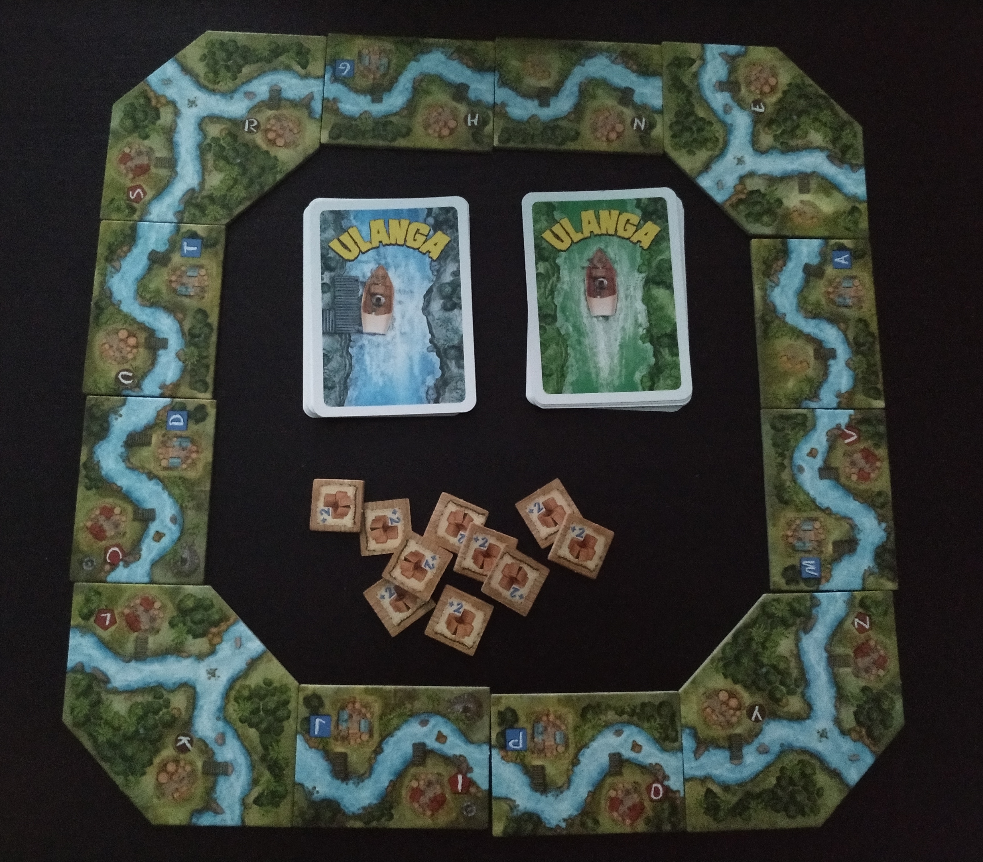 Antes de empezar con la partida, deberemos crear un río, uniendo las losetas, con la forma que más nos guste. Lo ideal es que sea circular pero puedes dejar volar la imaginación y crear caminos allá donde queráis. Colocaremos sobre él dos barcos al azar en dos puertos diferentes.