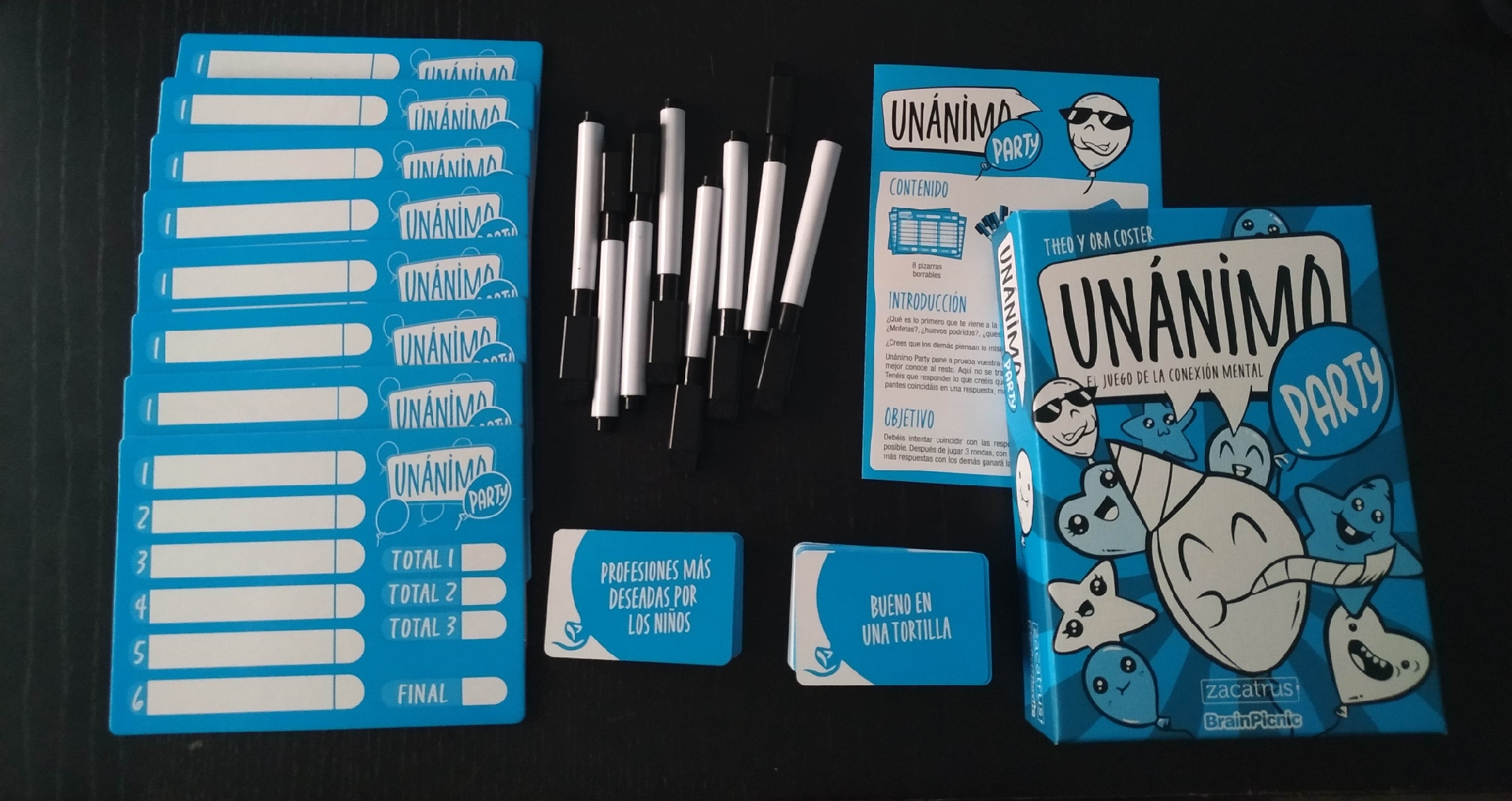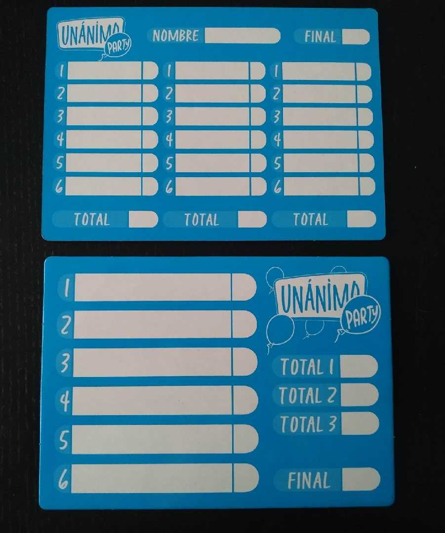 En cuanto a las diferencias entre ambas cajas, podemos ver que las tarjetas han cambiado de tamaño, ahora son más pequeñitas y lo que aparece en ellas cambia (no solo en temática): En Unánimo teníamos conceptos más genéricos y a esas palabras las acompañaba una ilustración mientras que ahora, en Unánimo Party, en las cartas solo hay texto y nos muestran temas más concretos y directos para que escribamos palabras sobre ellos.