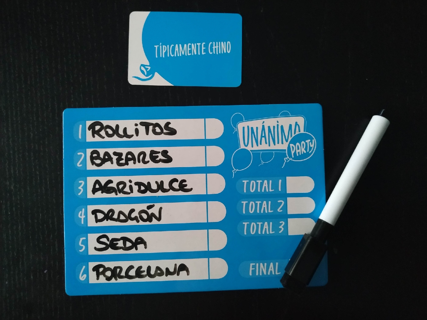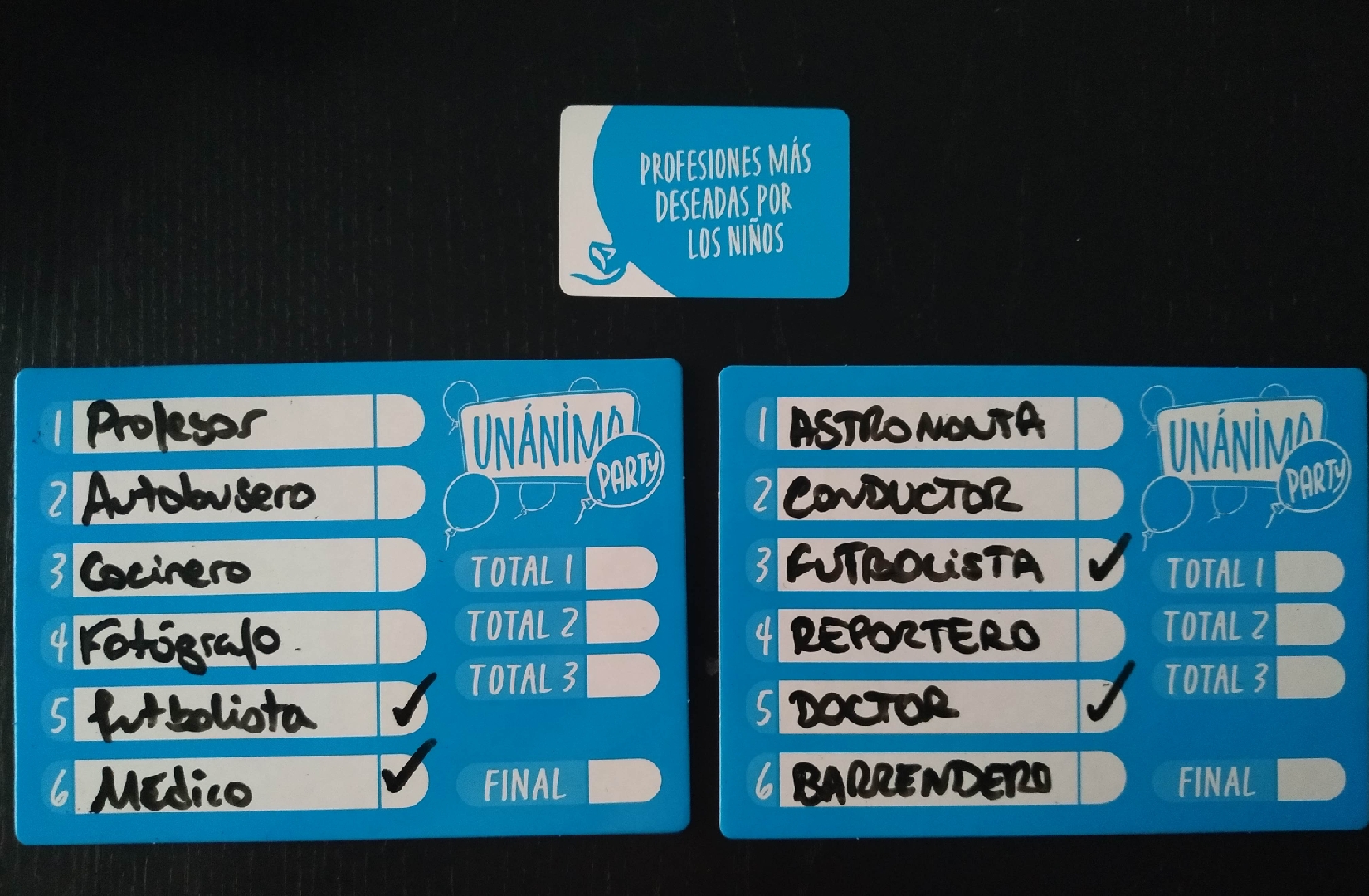 Como vemos, de nuevo se trata de conseguir adivinar qué van a escribir en sus pizarras el resto de jugadores y no tanto de escribir las palabras que creamos que se ajustan más al tema que ha aparecido. Hay que tener conexión mental y de nada sirve que escribamos palabras muy precisas, descriptivas o perfectas para una carta si el resto de jugadores ha escrito palabras más comunes o menos precisas. No puntuaremos en absoluto.