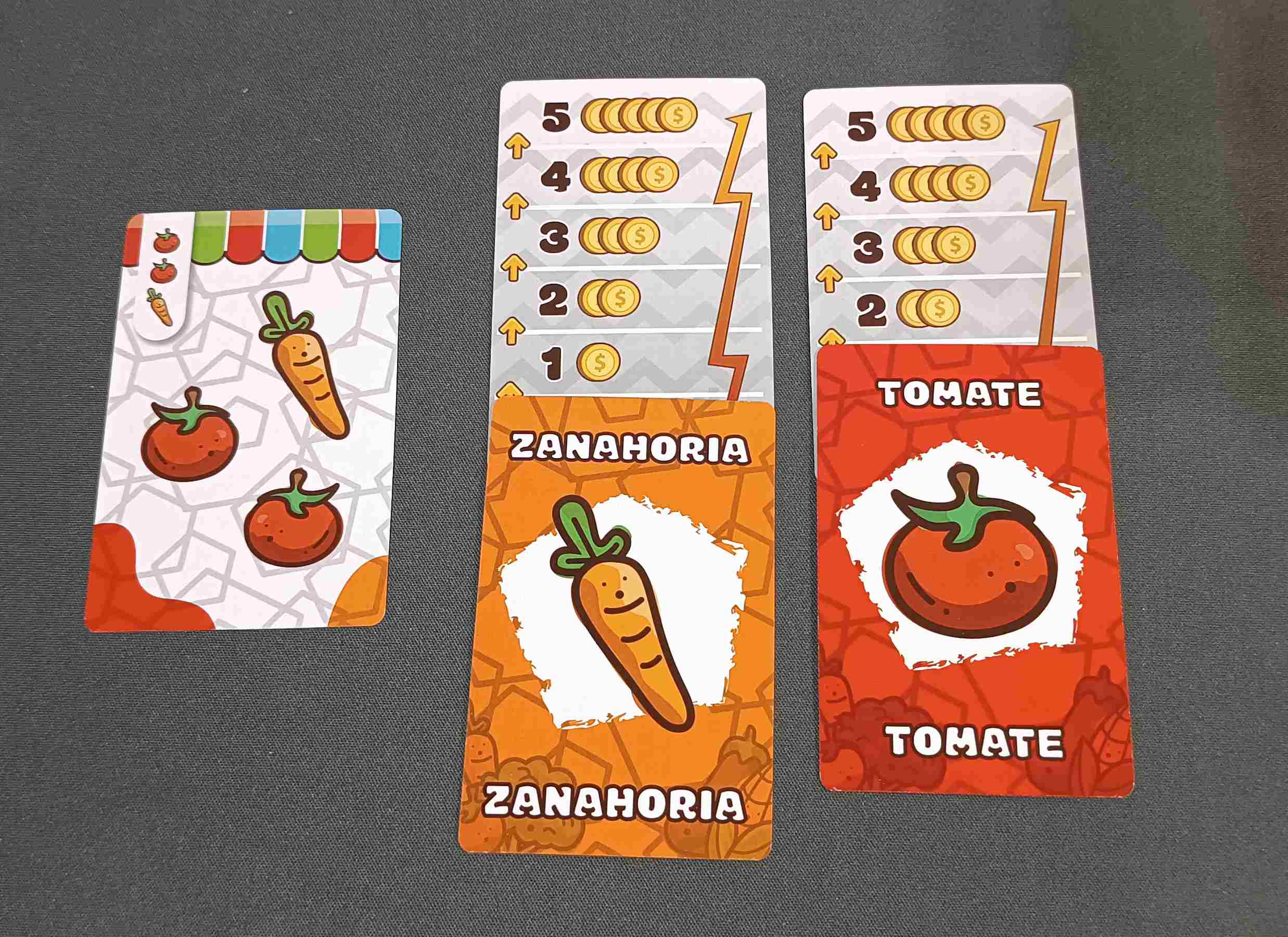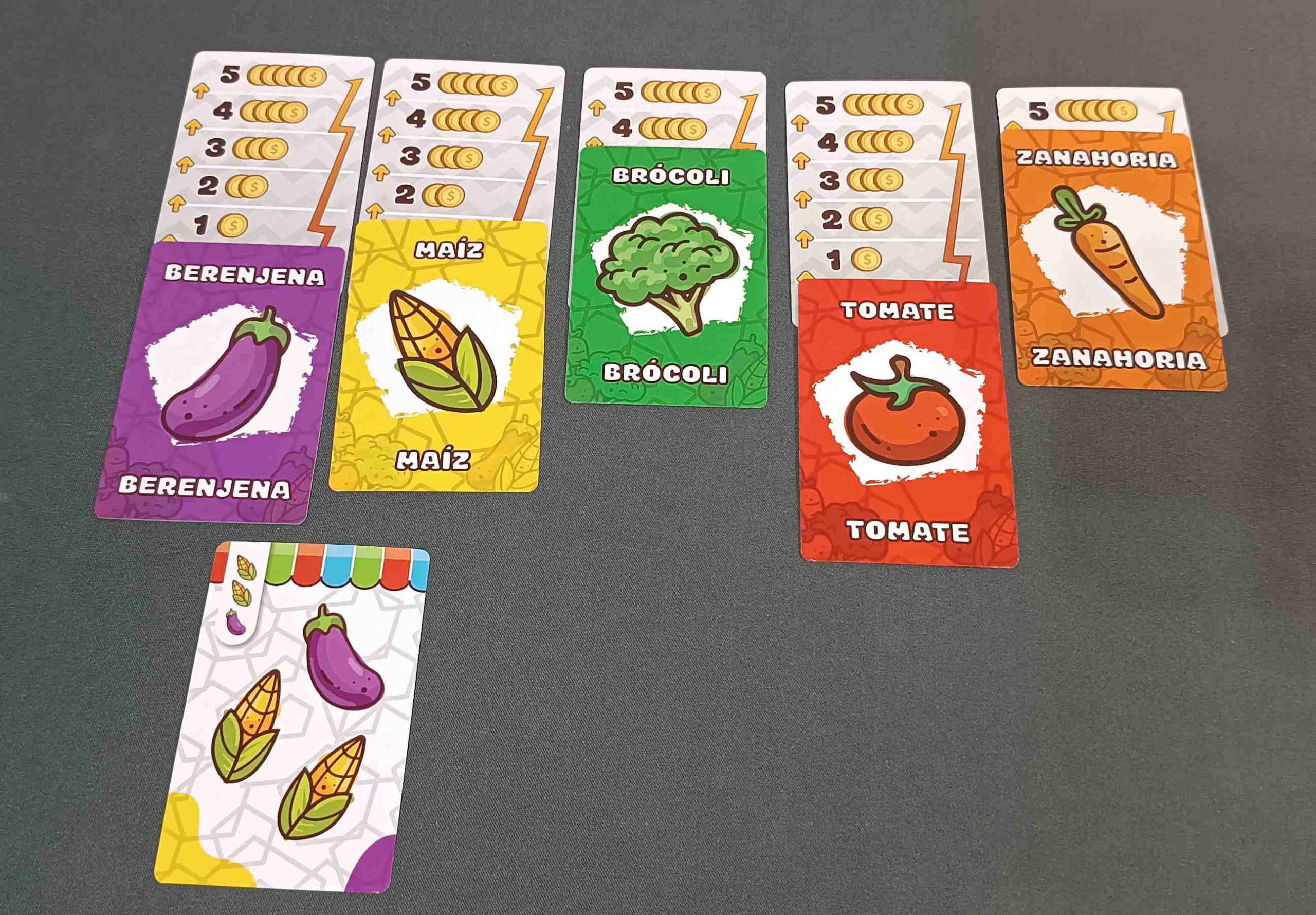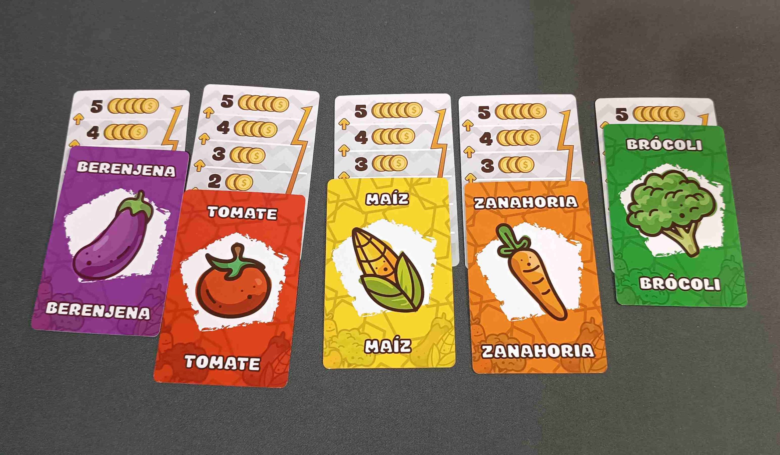 Dentro de la pequeña caja, nos encontramos con las 58 cartas que componen el juego. 5 ellas representan a las 5 verduras presentes en el juego: Lechuga, tomate, zanahoria, maíz y berenjena. Junto a ellas se encuentran las 5 cartas de valor, a dos caras y oscilando los precios desde el euro hasta los 5, que será al valor más alto que podrá adquirir una verdura en toda la partida.