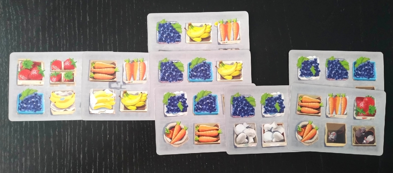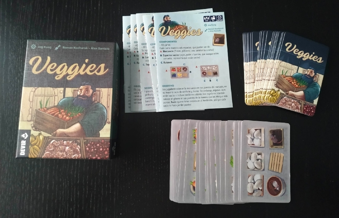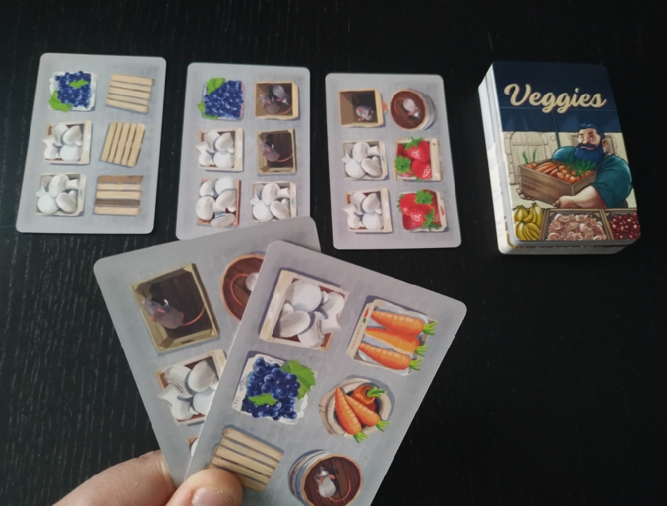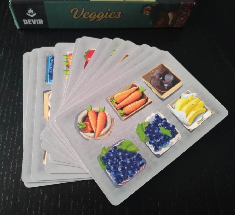 En Veggies usaremos nuestras cartas para recrear un puesto de mercado de frutas y verduras. Deberemos colocar las diferentes mercancías lo más vistosas posibles teniendo en cuenta que hay cajas vacías o incluso algunas que tienen ratones que van comiéndose los alimentos.
