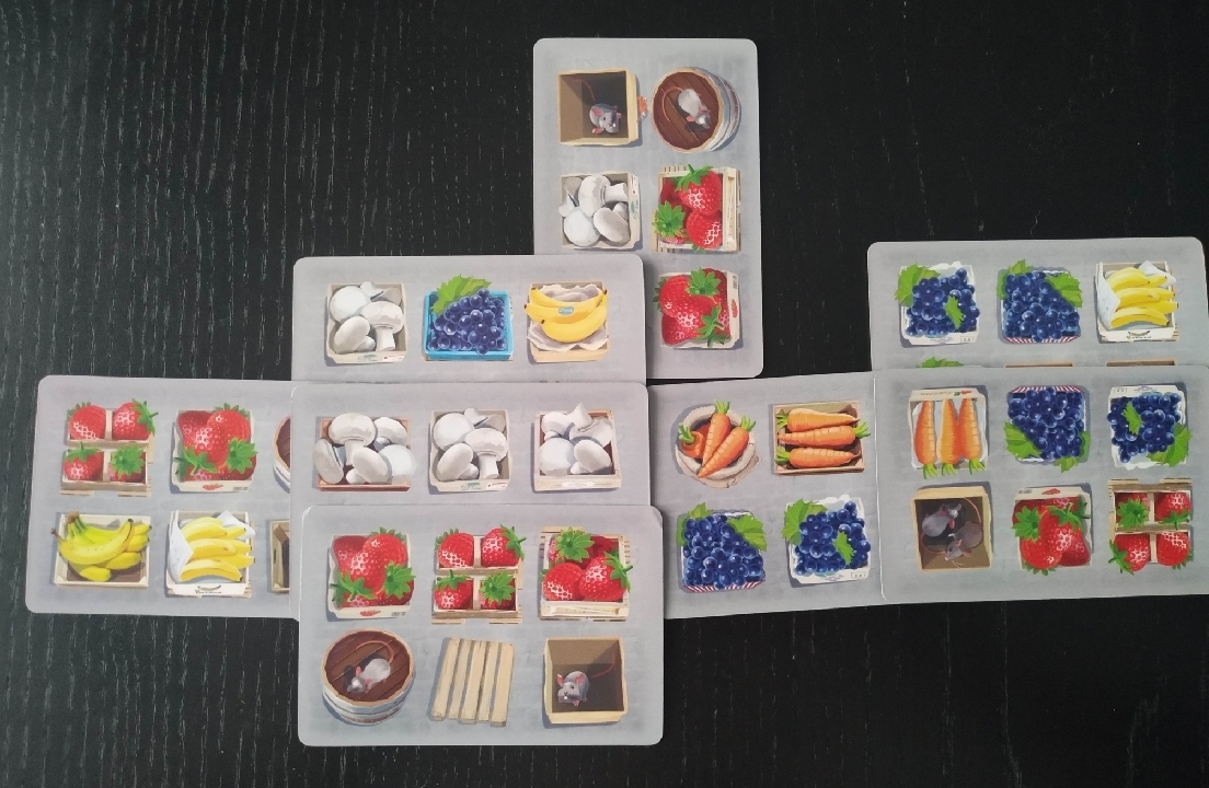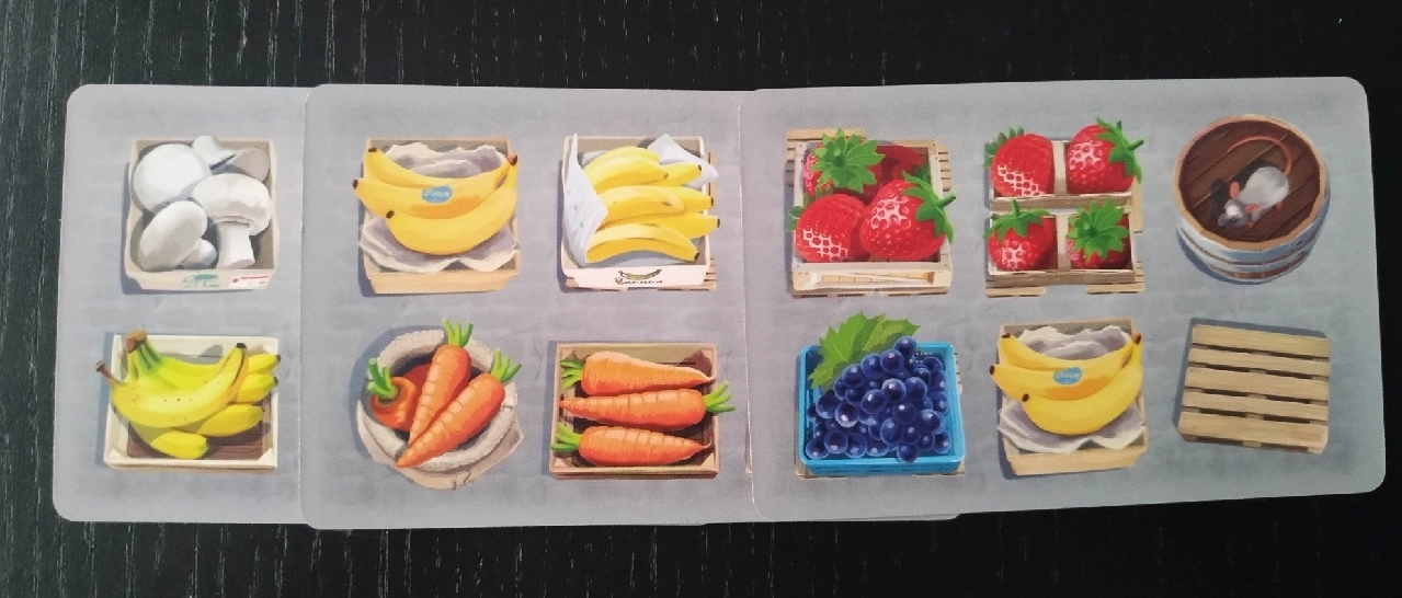 Los componentes son solamente cartas pero más que suficiente para poder crear nuestro tenderete de frutas y verduras bien llamativo. De buen gramaje y muy coloridas, nos muestran fresas, zanahorias, champiñones, plátanos y uvas bien apetecibles. También aparecen palés y cajas vacías dentro de las cuales podemos encontrar a los no tan amigables ratones buscando su alimento.