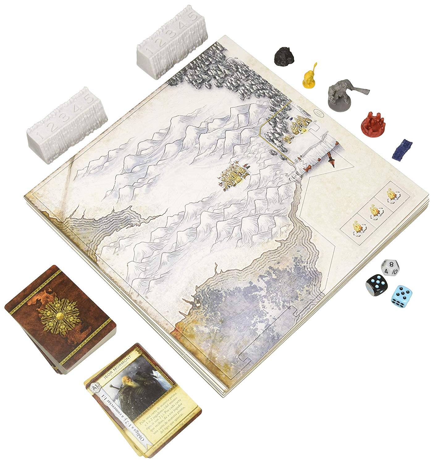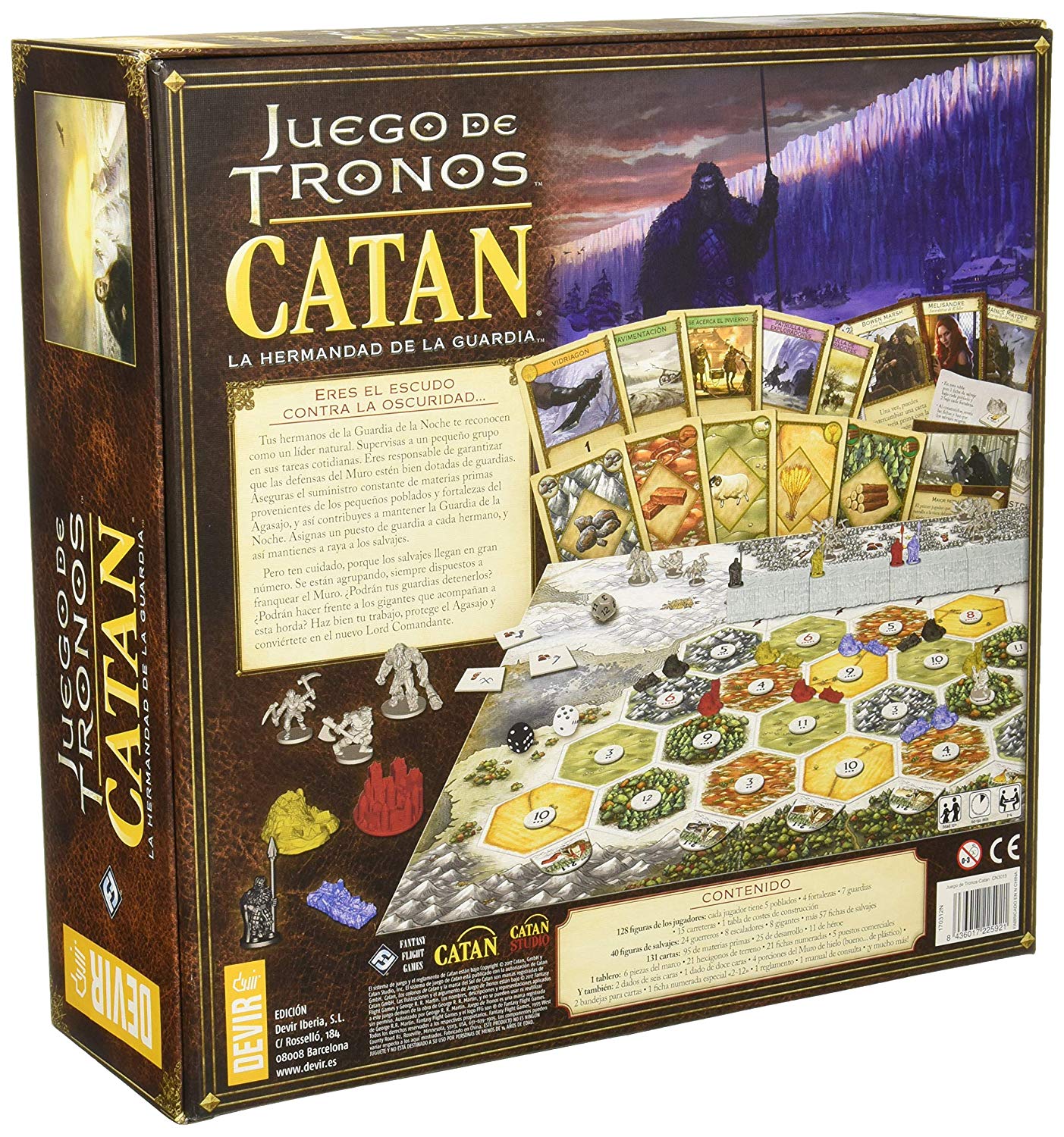 - Incluye: 124 figuras de los jugadores, 20 poblados (5 para cada jugador), 16 fortalezas (4 para cada jugador), 28 guardias (7 para cada jugador), 56 carreteras (14 para cada jugador, 4 tabla de costes de construcción (1 para cada jugador), 40 figuras de salvajes, 24 guerreros, 8 escaladores, 8 gigantes, 57 fichas de salvajes, 131 cartas, 95 de materias primas, 25 de desarrollo, 11 de héroe, 1 tablero, 6 piezas del marco, 21 hexágonos de terreno, 21 fichas numeradas, 5 puestos comerciales, 2 dados de seis caras, 1 dado de doce caras, 4 porciones del muro de hielo (de plástico), 2 bandejas para cartas, 1 ficha numerada especial «2-12», 1 reglamento, 1 manual de consulta.