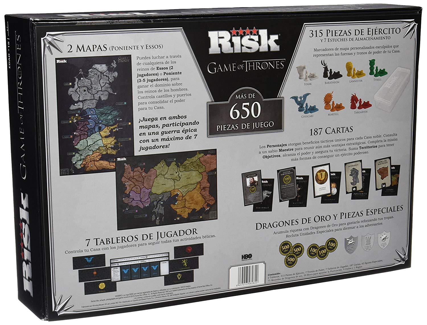Cada ejército contará con 45 piezas entre las que tendrás una con el emblema de cada casa (el lobo para los stark, el león de los Lannister, el cuervo de Arryn, el dragón Targayen, entre otras). Además, esta versión de Risk incluye dos mapas, uno de Poniente y otro que permite formas distintas de juego.