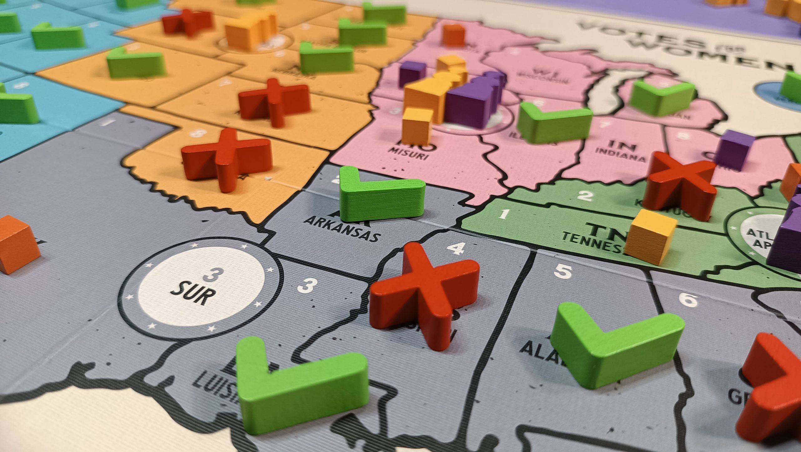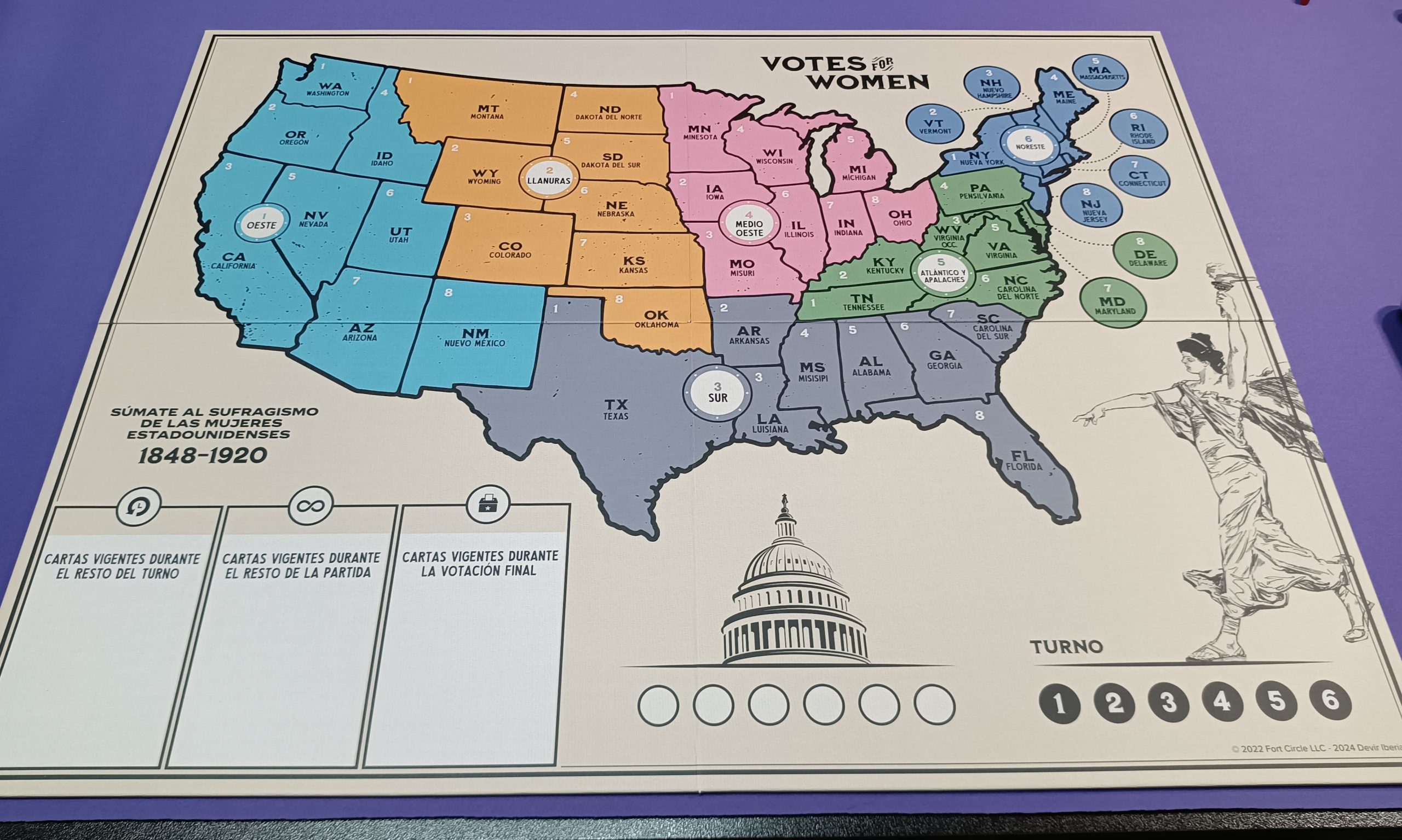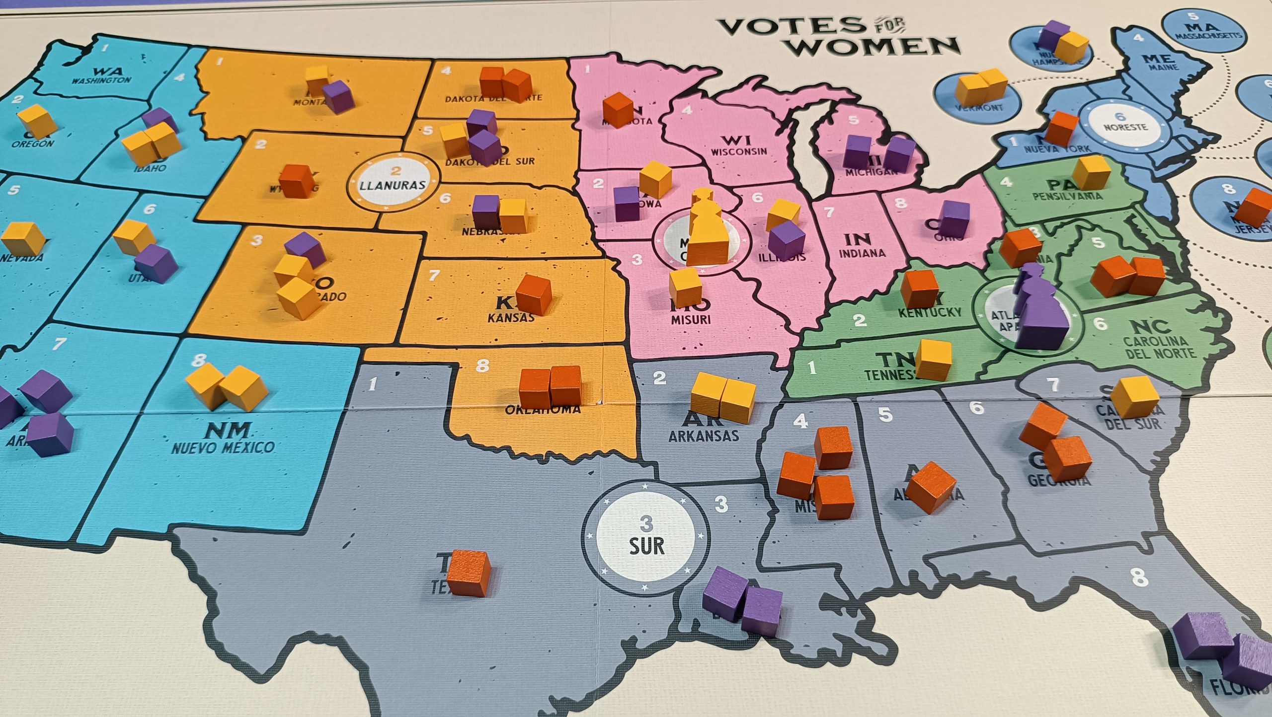 Uno de los aspectos más destacados de Votes for Women es la calidad y la atención al detalle de sus componentes. El juego incluye un tablero grande que representa un mapa de los Estados Unidos dividido en seis regiones, lo que permite visualizar claramente el objetivo de control de influencia política en cada estado. Además, el juego viene con más de 190 cubos y fichas que se utilizan para representar la influencia política en los diferentes estados, lo cual añade un elemento táctico y visual al desarrollo de la partida.
