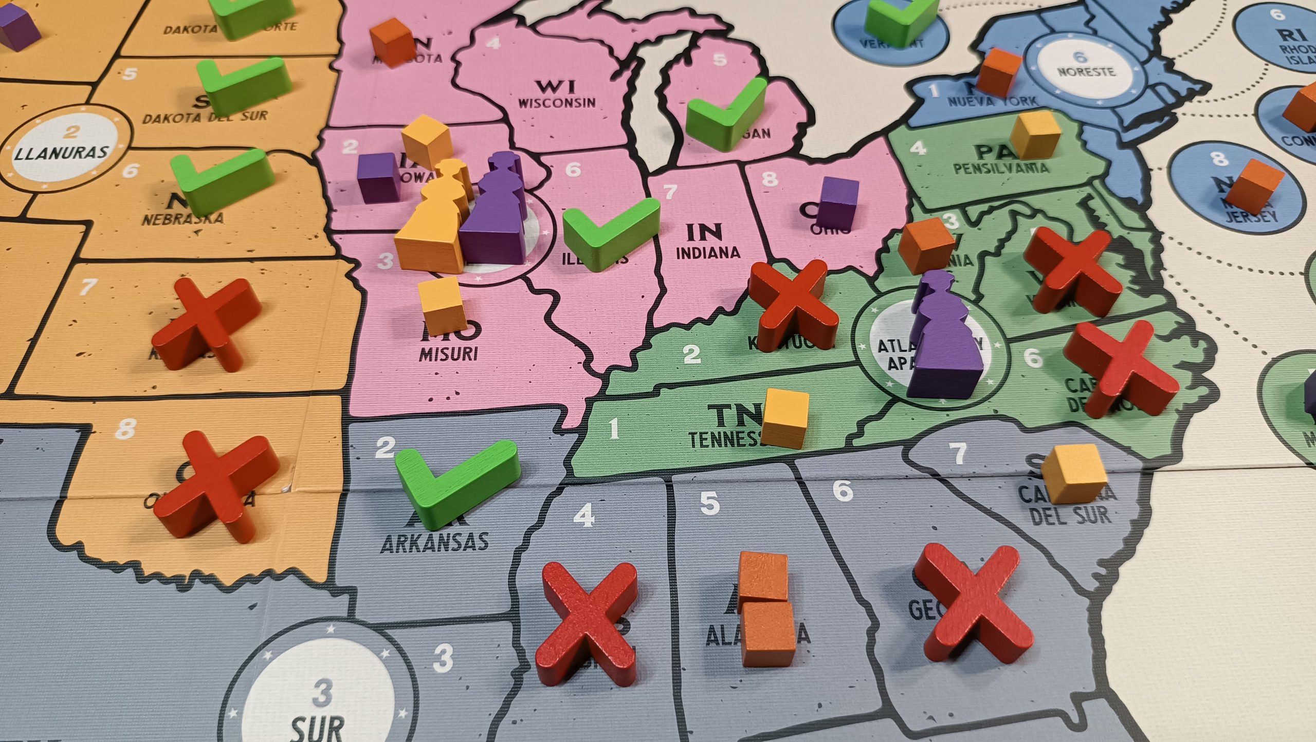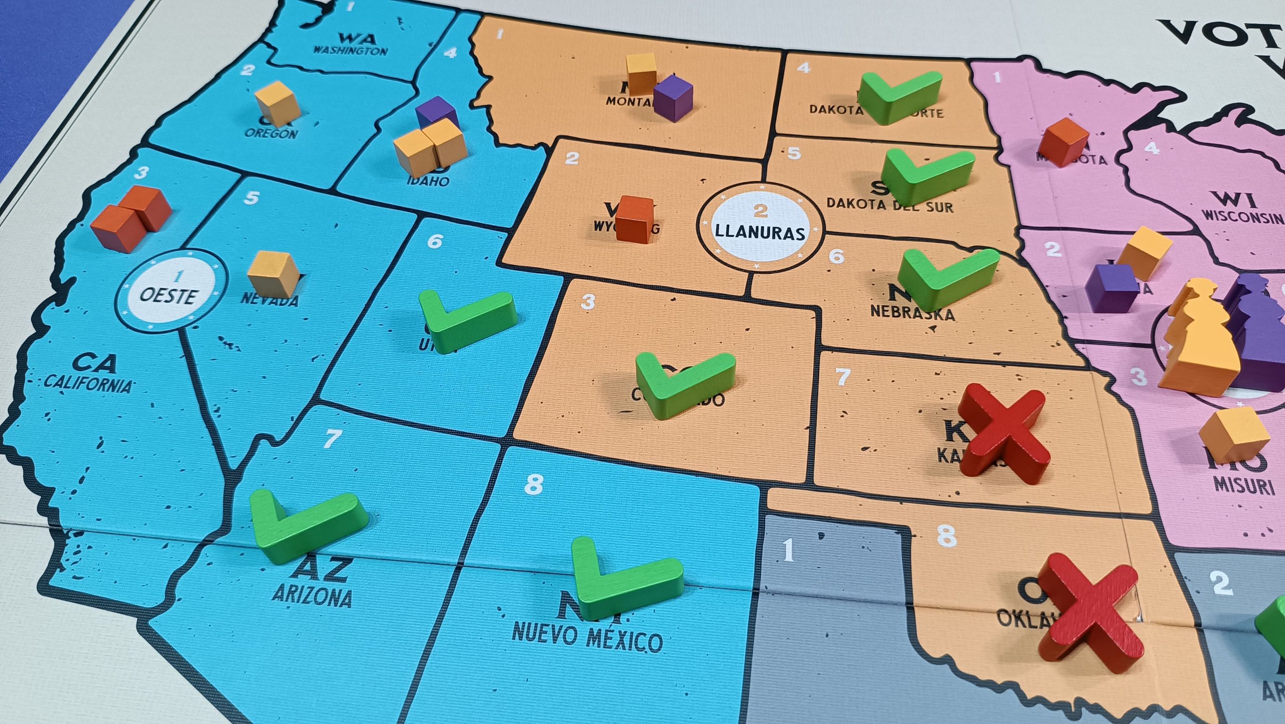Al colocar cubos en un estado, primero se deben quitar los cubos del oponente (uno por uno). - Como organización: El jugador obtiene tantas chapas como fichas de activista tenga en el tablero.