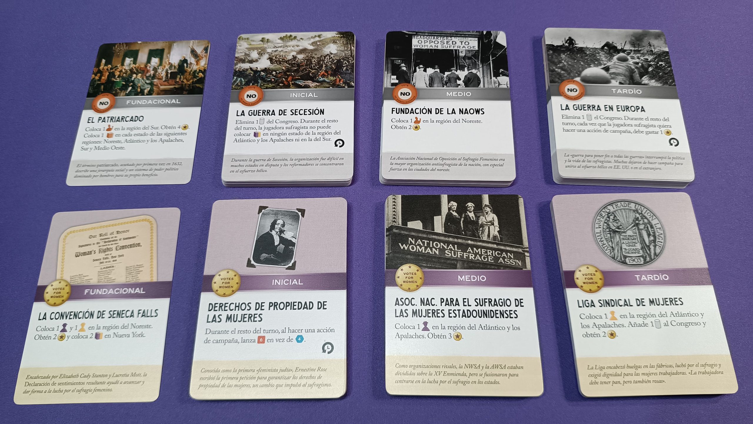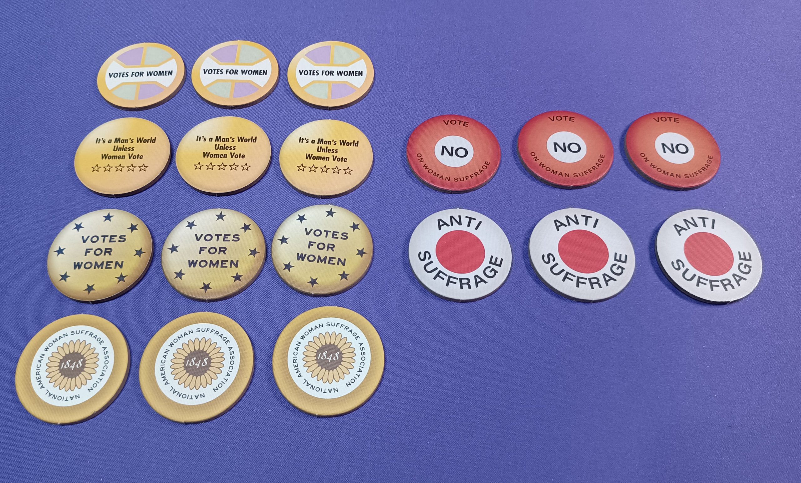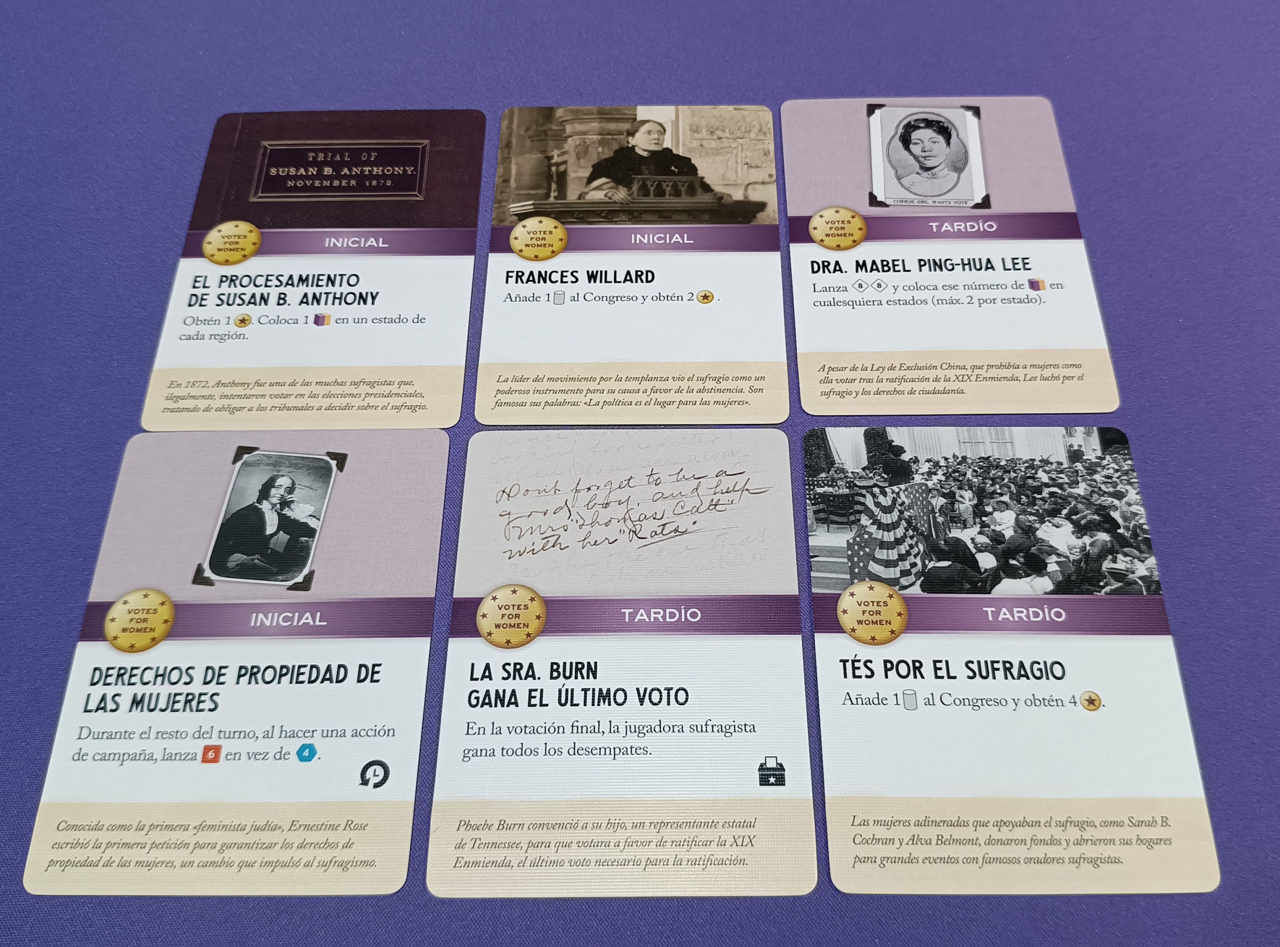 - 2 fichas de campaña por color (Sufragistas: morado y amarillo / Oposición: rojo)