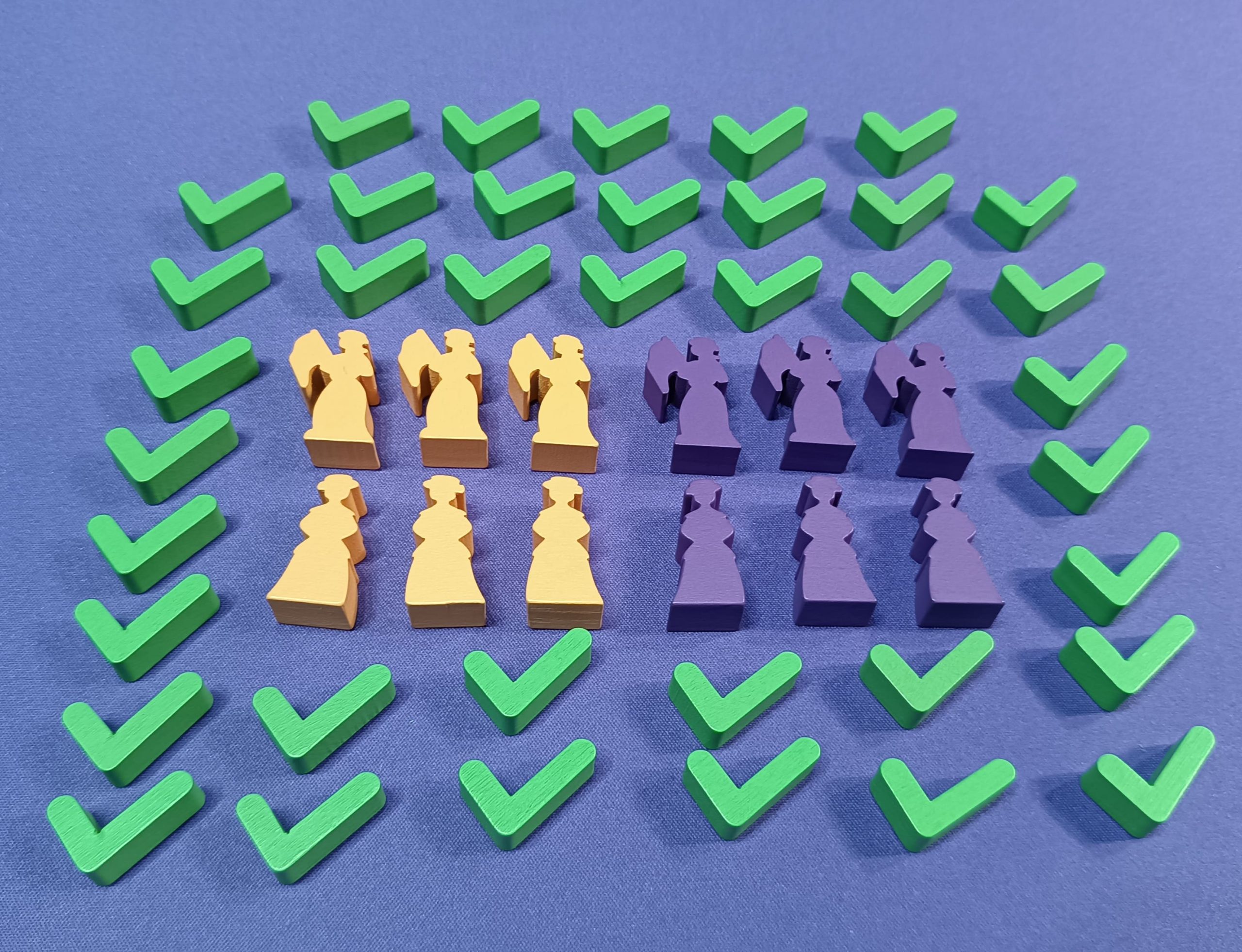 - 65 cubos morados y 65 amarillos (Sufragistas), 60 rojos (Oposición)