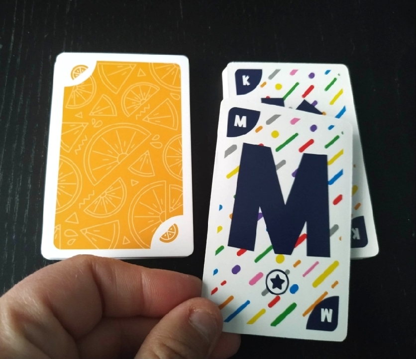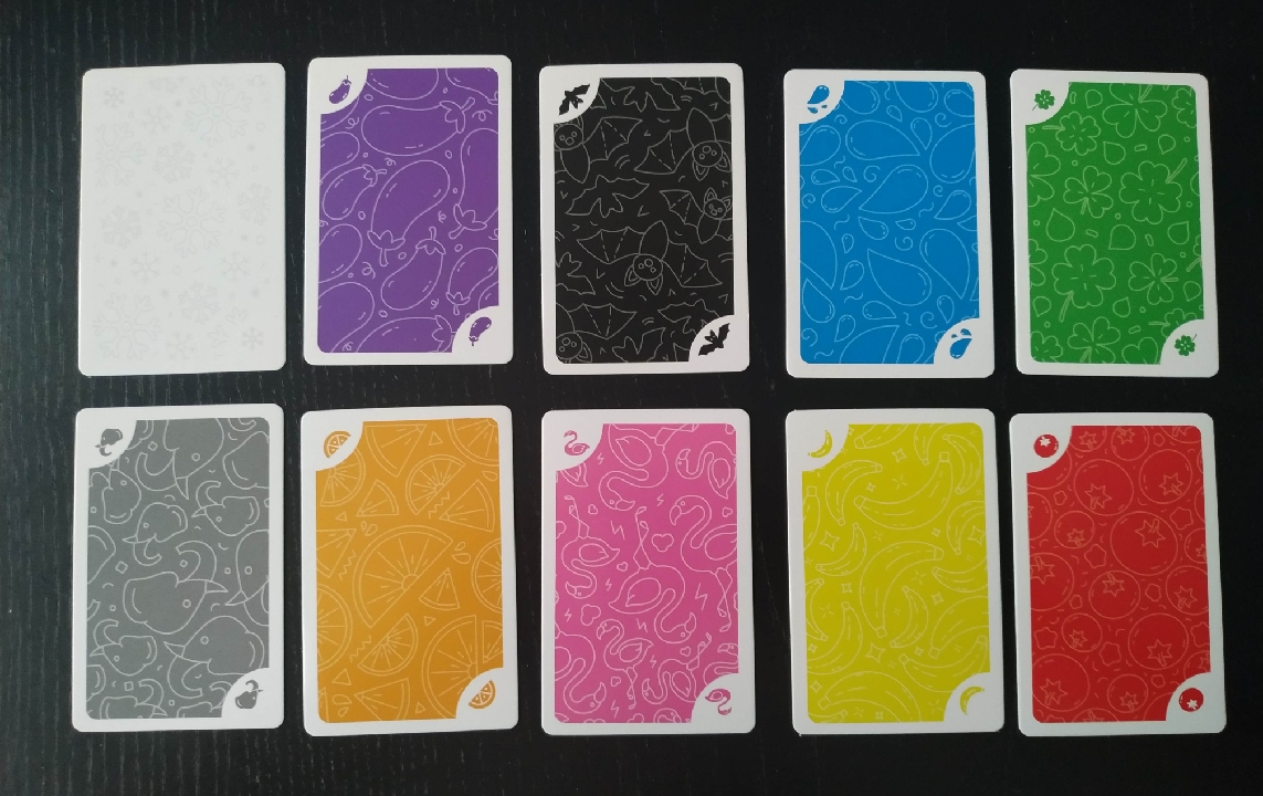 Su nombre invita a abrir la caja donde encontraremos unas cartas de buen gramaje que siguen la misma estética, en una de sus caras, que la caja. En dicha cara de las cartas encontramos fondo blanco con rayas de colores y unas letras bien grandes azules bajo las que en algunas aparecen estrellas y en otras no. Sin embargo, por el otro lado, nos muestran colores y llevan serigrafiados objetos, en su fondo y en dos de sus esquinas, que pueden asociarse a ese mismo color.