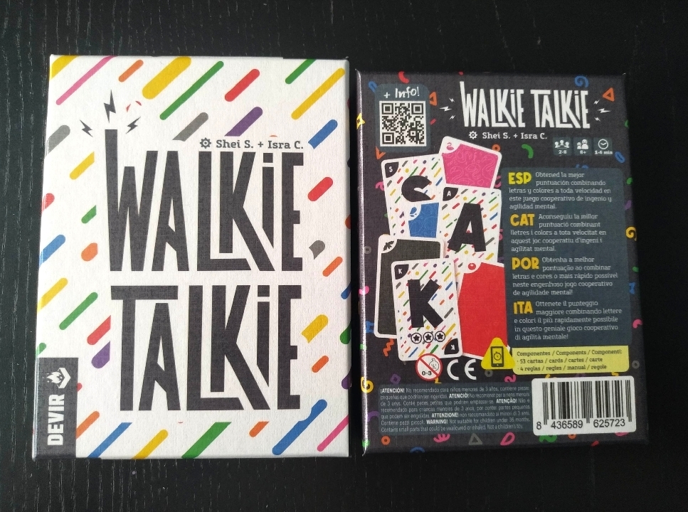 En una caja pequeña, poco pesada y manejable de fondo blanco, este juego llama tremendamente la atención por sus mini rayas coloridas que ocupan toda la portada y por su llamativo nombre que nos evoca a algo que seguro que a todos nos han gustado, antes de que se inventaran los teléfonos móviles, esos walkie talkies con los que poder comunicarnos en la distancia con otras personas de forma casi mágica, sobre todo en campamentos o excursiones que hacíamos a más temprana edad.