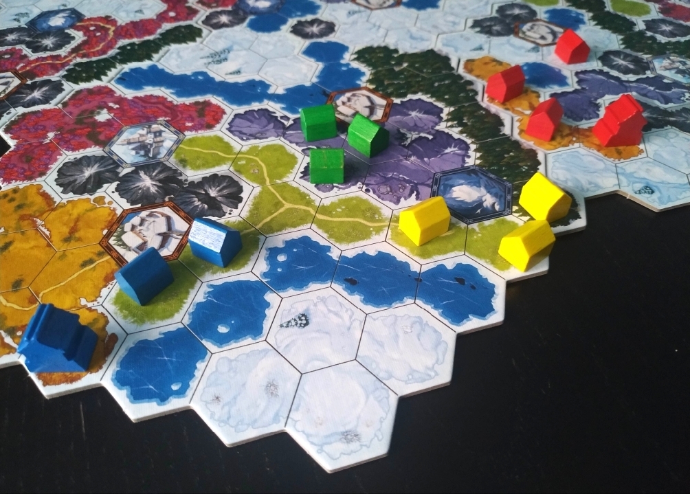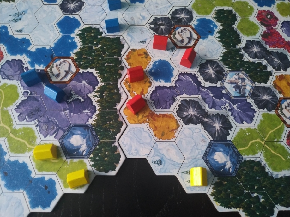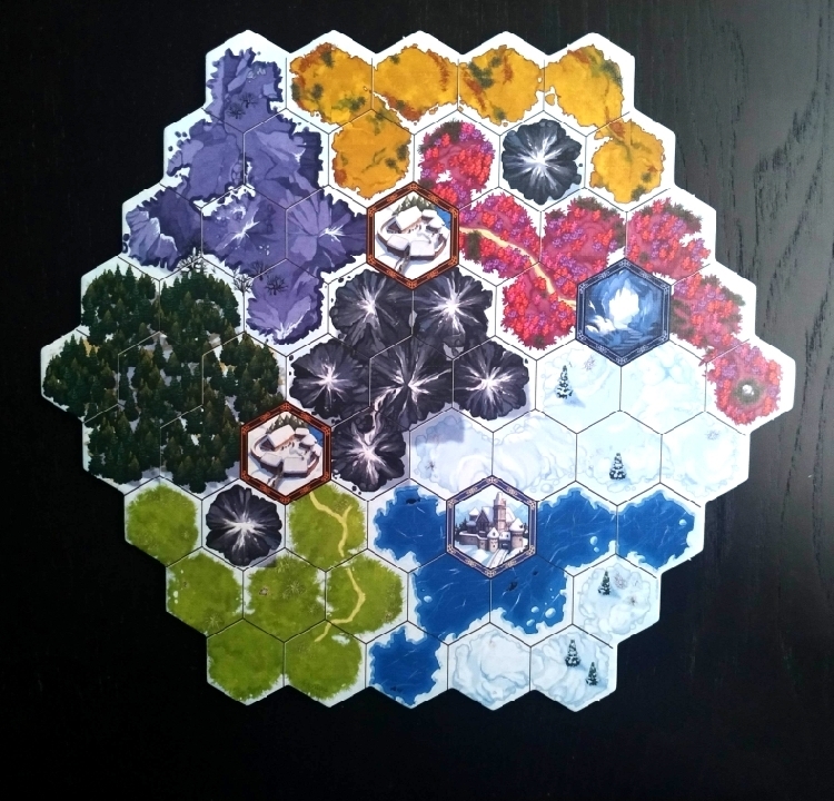 Otra de las diferencias fundamentales que encontramos en el tablero y que afecta directamente a la jugabilidad es que si antes teníamos 9 tipos de hexágonos, 5 de ellos edificables (prado, barranco, desierto, flores y bosque) y 4 de ellos no edificables (castillo, agua, montaña y lugares), ahora en Winter Kingdom tenemos 11, de los cuales, 7 de ellos son edificables (flores, pradera, tundra, cerro, nevado, bosque y hielo) y 4 no (montaña, túnel, aldea y castillo).