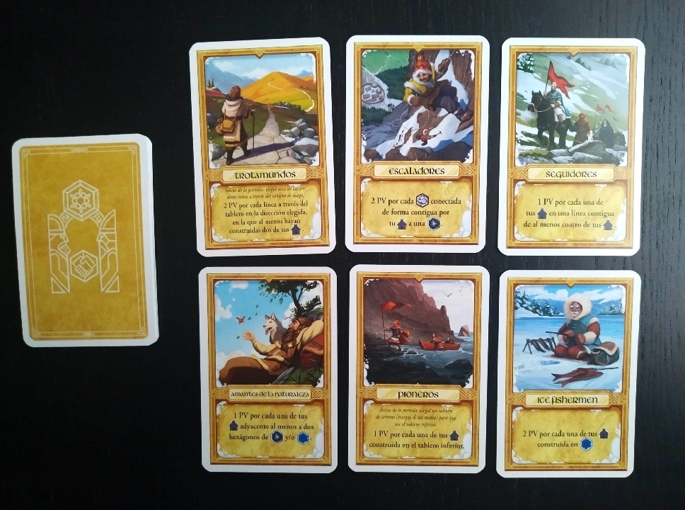 Al comienzo del juego, en Winter Kingdom seguimos sacando tres de las dieciocho cartas de puntuación diferentes que componen el juego y que marcarán drásticamente la estrategia de los jugadores y su forma de expandir sus territorios en cada turno y que, al final de partida, se tendrán en cuenta para puntuar. En este sentido, aquí de momento no hay ningún cambio salvo por las diferencias existentes entre las formas de puntuar que tienen las cartas del Winter Kingdom frente a las cartas del Kingdom Builder.