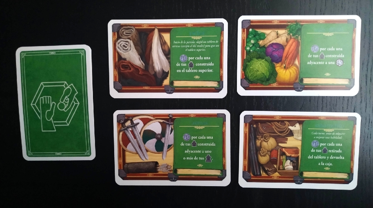 Estas cartas indican el requisito que se debe cumplir para obtener monedas durante dicha partida. Cada vez que un jugador coloca sus casas o fuertes deberá comprobar si cumple o no el requisito y si lo cumple adquirir las monedas que se indique.