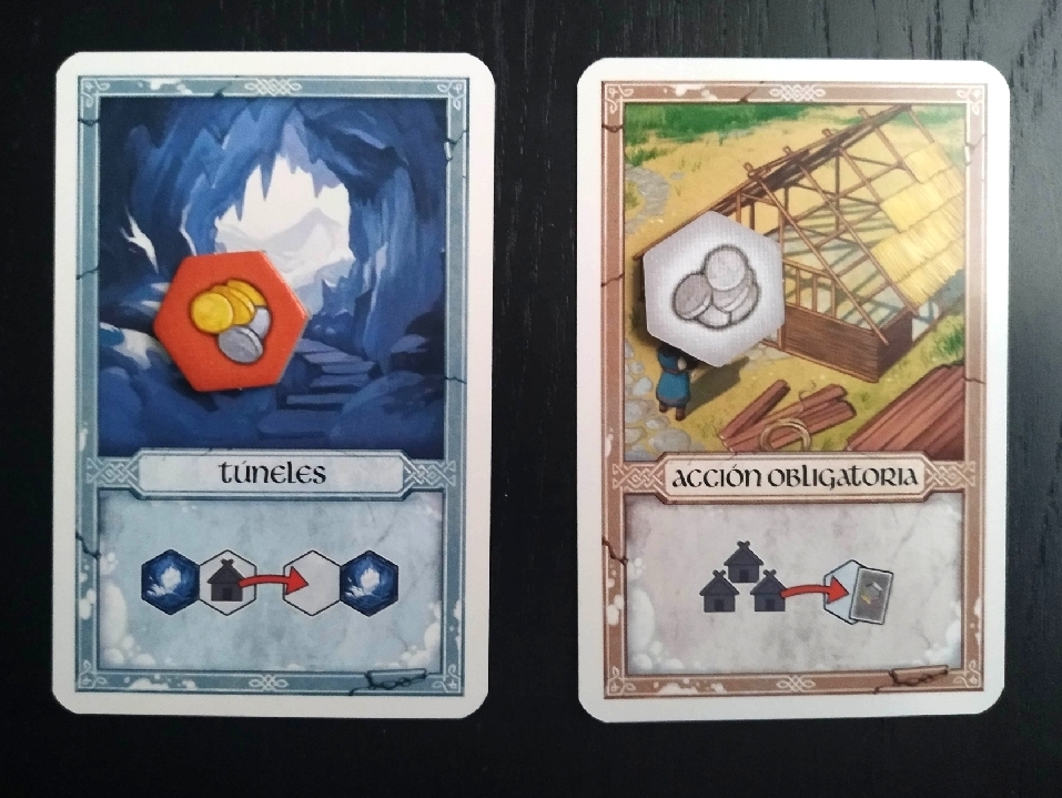 El siguiente elemento diferenciador son las fichas de recurso. Cada jugador dispondrá de siete y son básicamente fichas que colocaremos encima de las cartas para indicar qué habilidades tenemos activas, cuáles hemos utilizado y cuáles no. Son siete porque además de las posibles cinco cartas de recurso que podremos comprar de nuestra mano, el juego también incorpora las cartas de túnel y las cartas de acción obligatoria. Se darán una de cada para cada jugador y representan simplemente tanto la acción obligatoria del jugador de colocar las tres casas en los terrenos que indique la carta que ha robado en este turno y la posibilidad de realizar la acción de túnel.