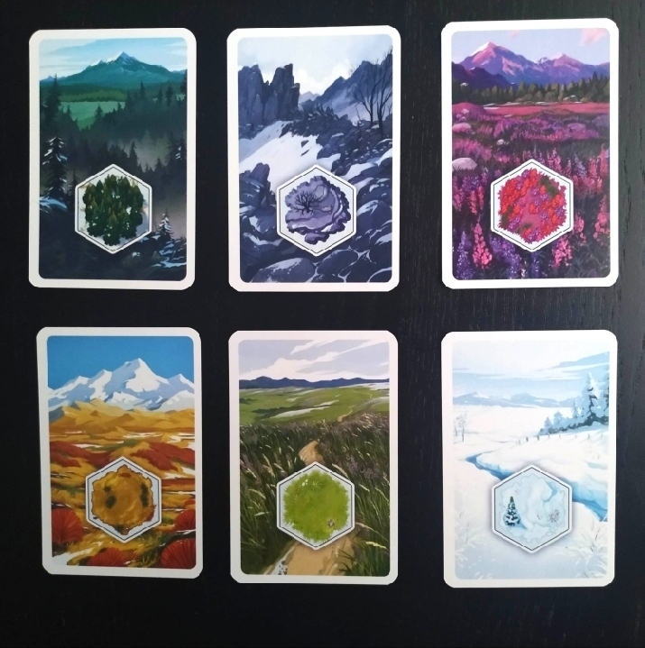 Las cartas de terreno muestran todos estos terrenos a excepción del hielo, que se podrá construir en él pero gracias a alguna acción especial y no a través de las cartas de terreno.