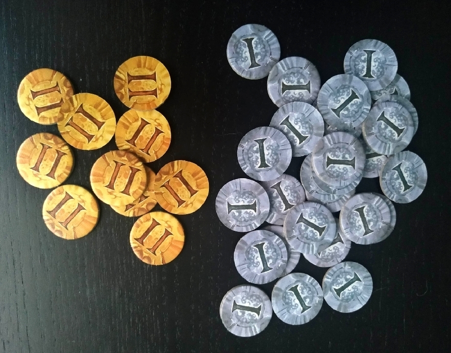El siguiente elemento que vemos en la caja, y quizás uno de los que más sorprenden, son las fichas de monedas. Si, efectivamente, el juego incorpora dinero y junto al cómo se consigue y el para qué sirve son de las grandes novedades que incorpora el juego y que cambia radicalmente ciertos aspectos de cómo se juega a Winter Kingdom.