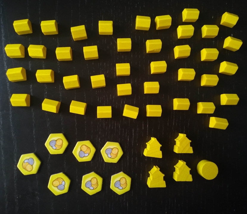 Otro de los elementos estrella que nos encontramos dentro del juego, lógicamente son las casas que debemos construir en dichos tableros. En Kingdom Builder, cada jugador disponía de 40 casas, mientras que aquí tendremos solo 32 por jugador, pero también tenemos 4 fuertes. En esencia, los fuertes funcionan exactamente igual que las casas a la hora de construirlos, pero cobran una especial relevancia gracias a su valor estratégico debido a las dos diferencias fundamentales que tienen con las casas: la primera, y más importante, es que un fuerte equivale a dos casas construidas en dicho hexágono a todos los efectos y, la segunda, es que a cambio tienen la restricción de que no pueden ser recolocados.