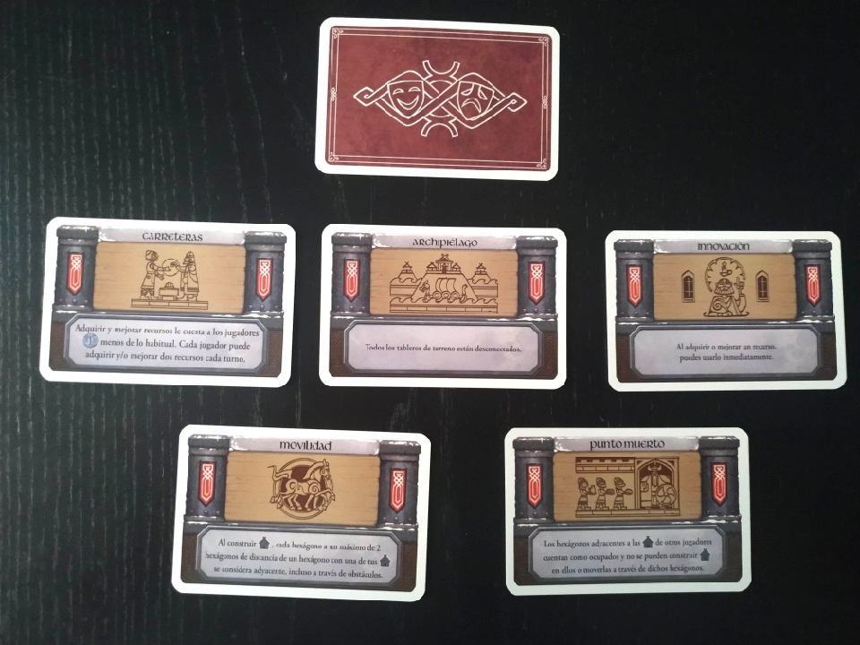 Estas cartas «simplemente» introducen cambios en las reglas del juego para dicha partida. Ponemos simplemente entre comillas porque en sí el elemento es bastante simple, pero conlleva cambios importantes en la estrategia de los jugadores en función de la carta que se utilice en cada partida. Tenemos también la opción de no utilizarlas, de hecho el juego recomienda no sacarlas en las partidas introductorias, pero una vez que conocemos el juego en profundidad, recomendamos usarlas porque los cambios son significativos e introducen mucha variabilidad y rejugabilidad.