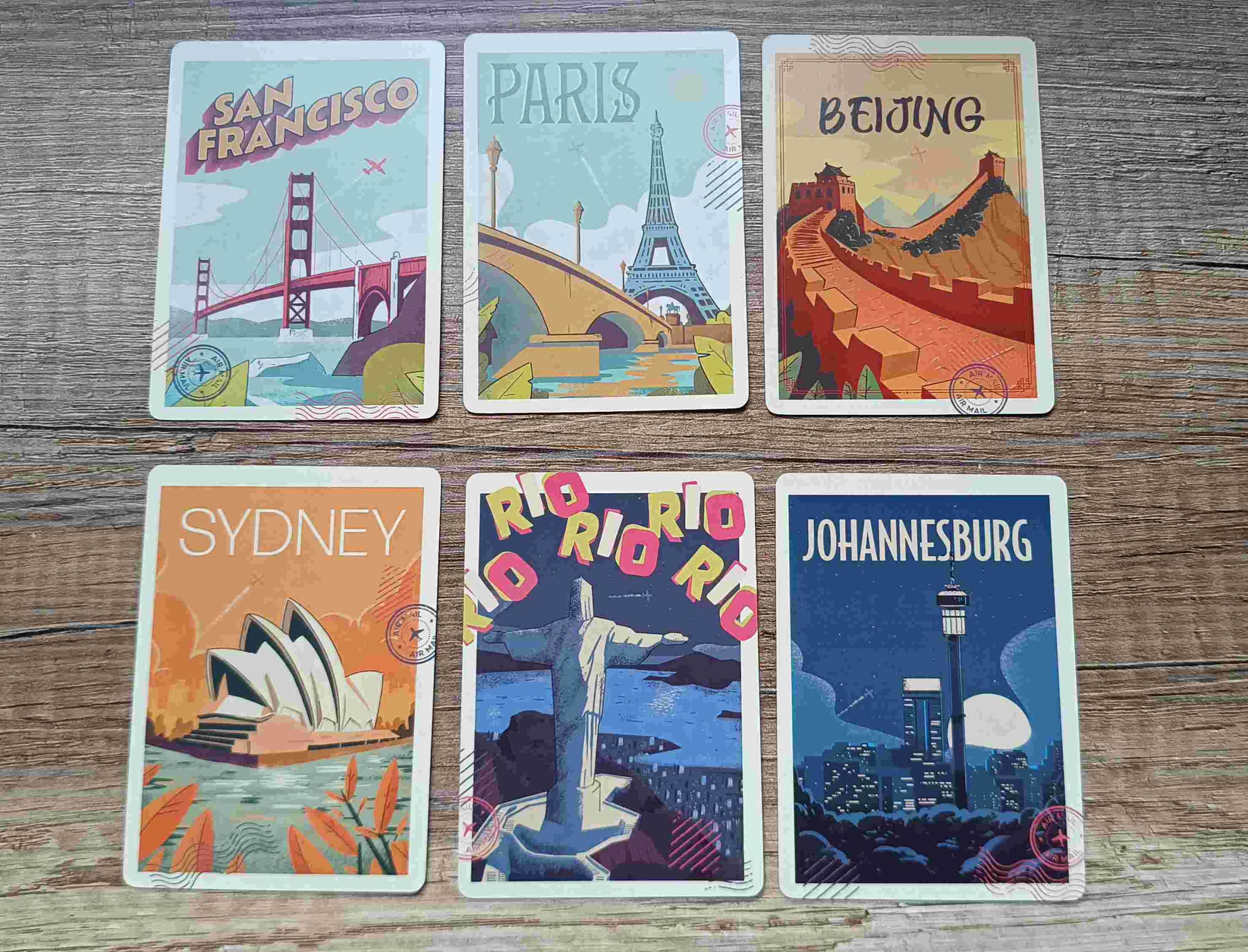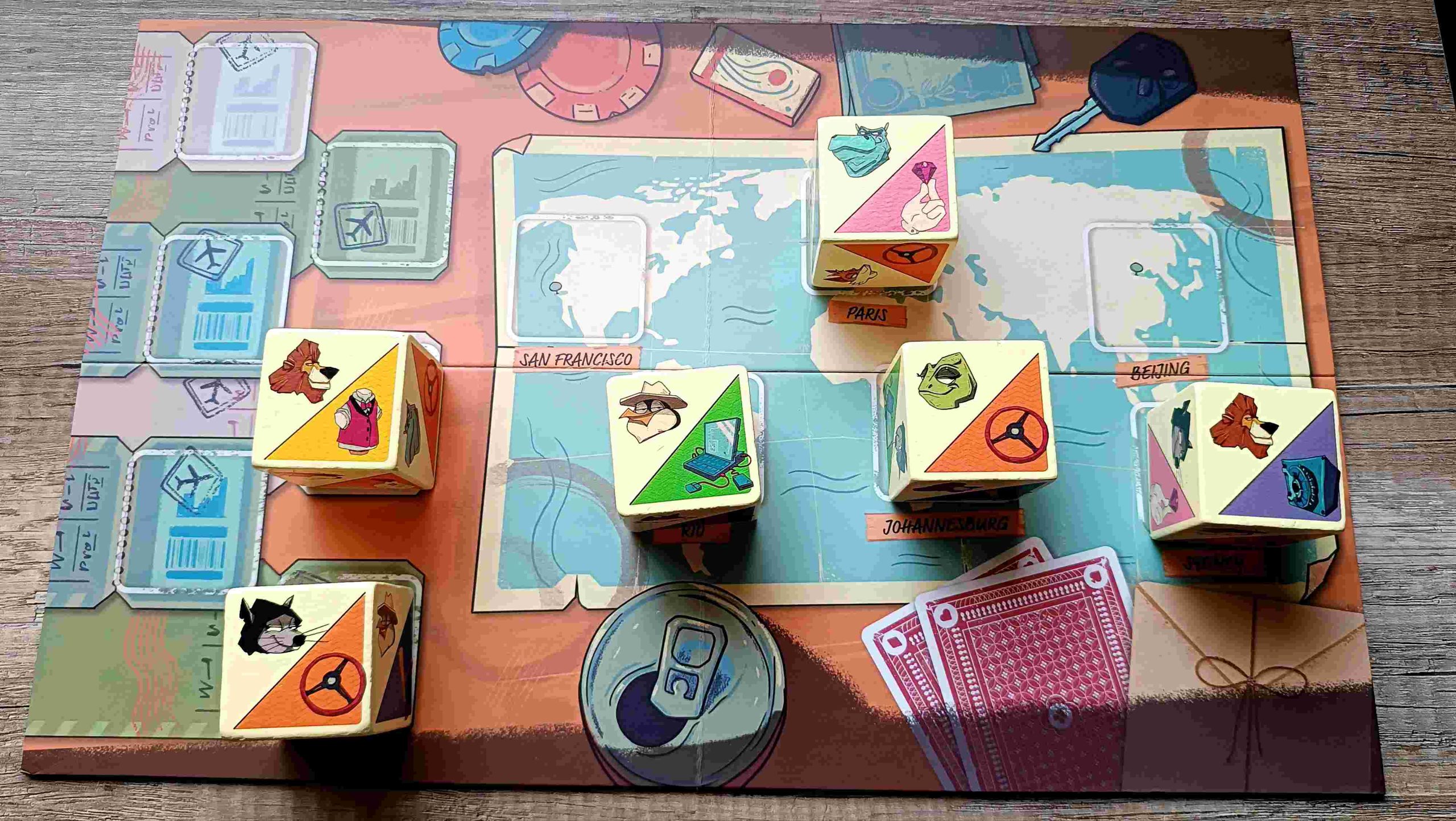 Colocaremos esos dados sobre tres ciudades del tablero y los sobrantes los colocaremos en la zona de viajes aleatoriamente sobre un billete de avión cada uno.